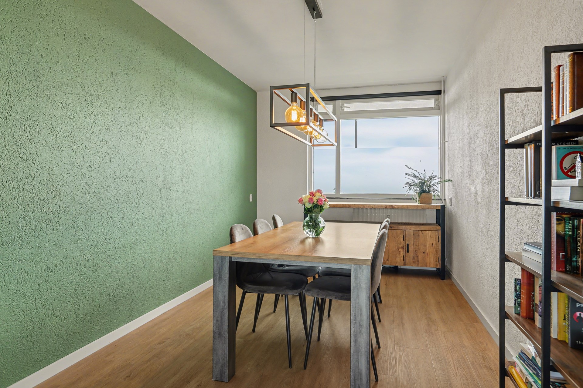 De woonkamer is een heerlijke leefruimte waar licht en ruimte direct opvallen. Dankzij de grote raampartijen stroomt het daglicht rijkelijk naar binnen en voelt de ruimte open en comfortabel aan. De pvc vloer en neutrale wanden zorgen voor een tijdloze uitstraling, terwijl de muurnis met houten legplanken een sfeervol accent toevoegt. Via de woonkamer heb je direct toegang tot het zonnige balkon. Voor extra wooncomfort is de woonkamer voorzien van een airco uit 2020.
