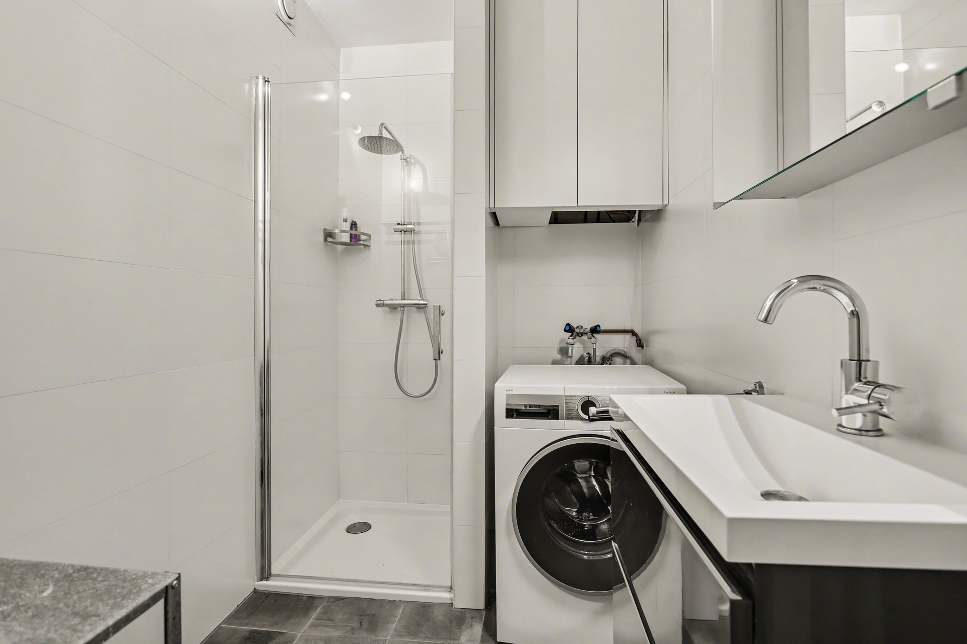 Naast de keuken is ook de badkamer in 2018 vernieuwd en volledig betegeld met witte wandtegels en een antracietkleurige vloer. De ruimte beschikt over een wastafel met meubel en spiegelkast, een moderne douche met regen en handdouche én mechanische ventilatie. In de vaste kast bevindt zich de boiler voor warm water (Daalderop 2018), met daaronder de aansluiting voor de wasmachine.