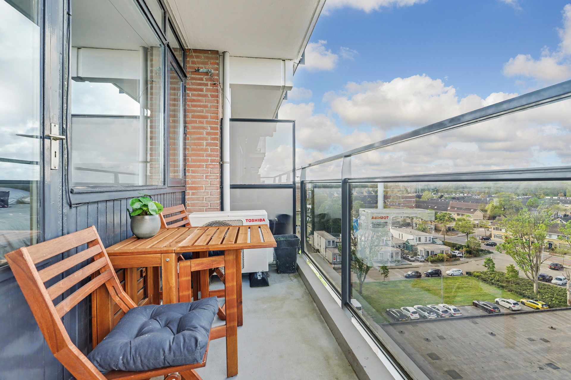Het ruime balkon is gelegen op het westen en biedt volop zon in de middag en avond. Hier geniet je hier optimaal van het weidse uitzicht over de omgeving. Het balkon is bereikbaar vanuit zowel de woonkamer als de slaapkamer, wat zorgt voor een fijne verbinding met buiten. Op het balkon staat het buitendeel van de airco installatie.