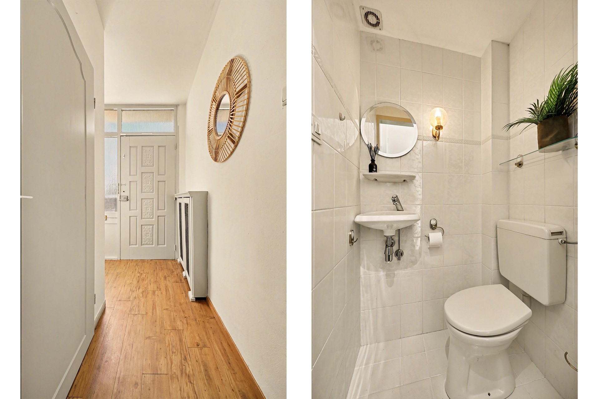 Bij binnenkomst stap je in de entree met garderoberuimte en het toilet. Het toilet is volledig betegeld en voorzien van een staand closet en een fonteintje. De entree is afgewerkt met een houten vloer.