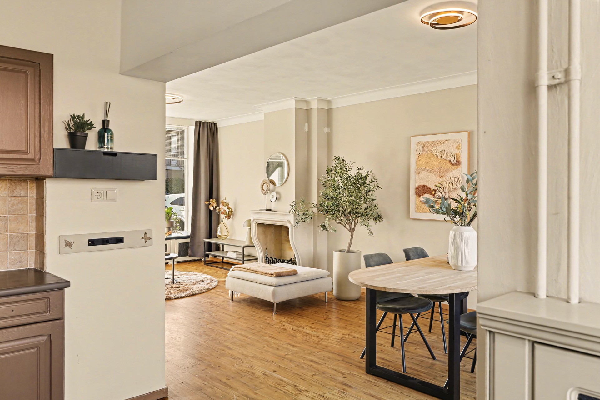 Wauw. Wat een samenspel van licht en ruimte. Deze doorzonwoonkamer strekt zich uit over de volledige lengte van de woning en is eveneens voorzien van een houten vloer. Aan de voorzijde zorgt het brede raam voor veel licht en vormt de open haard het uitnodigende middelpunt. Aan de achterzijde ligt de eetkamer, een heerlijke plek voor lange diners, gezellige spelletjesavonden of rustig natafelen met uitzicht op de tuin.