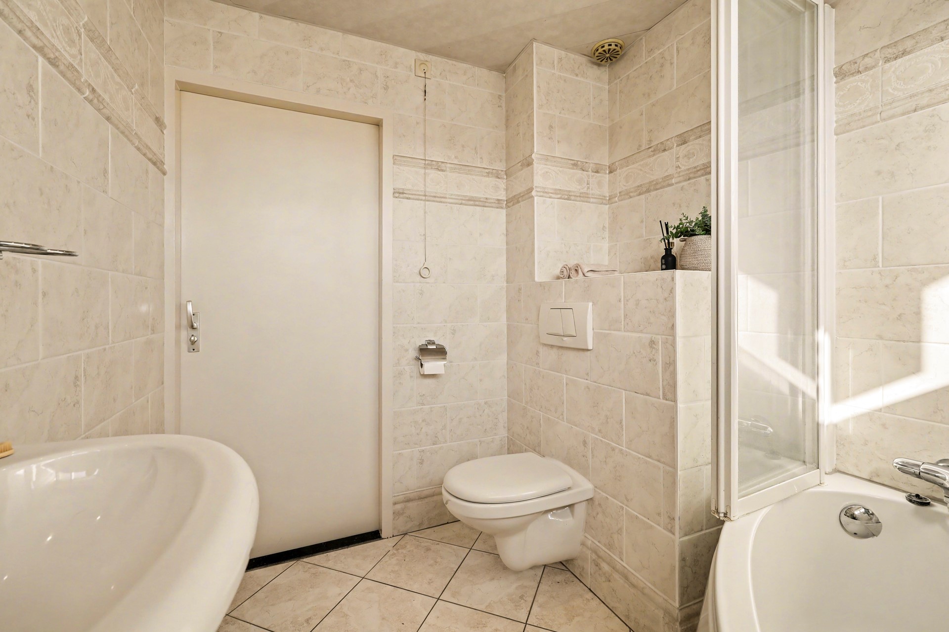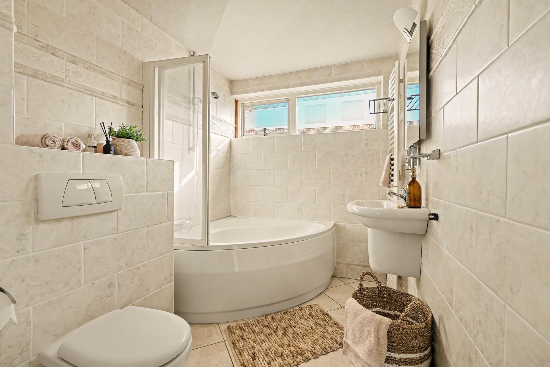 De badkamer is volledig betegeld en voorzien van een hoekbad met douche, wandcloset en wastafel. Het raam zorgt voor daglicht én ventilatie, waardoor dit een prettige ruimte is om de dag te beginnen.