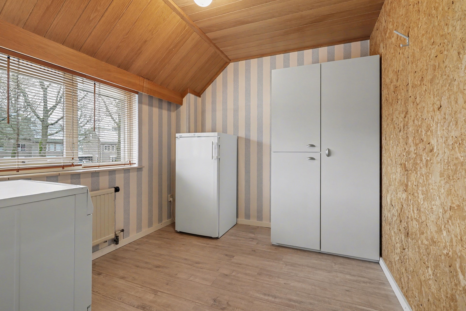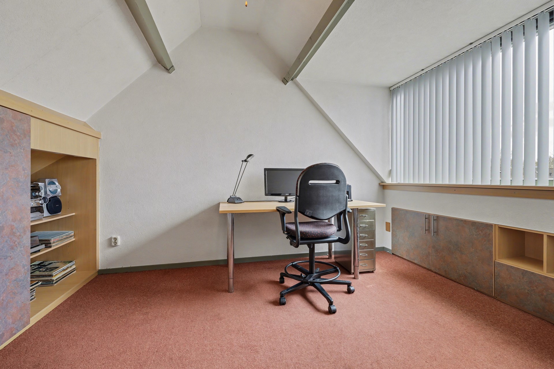 De achterzolder is in gebruik genomen als thuiswerkplek maar kan prima als vierde slaapkamer functioneren door de aanwezigheid van een groot dakkapel wat zorgt voor meer dan voldoende daglicht in deze ruimte. Aan weerszijde zijn wederom praktische bergkasten gerealiseerd.