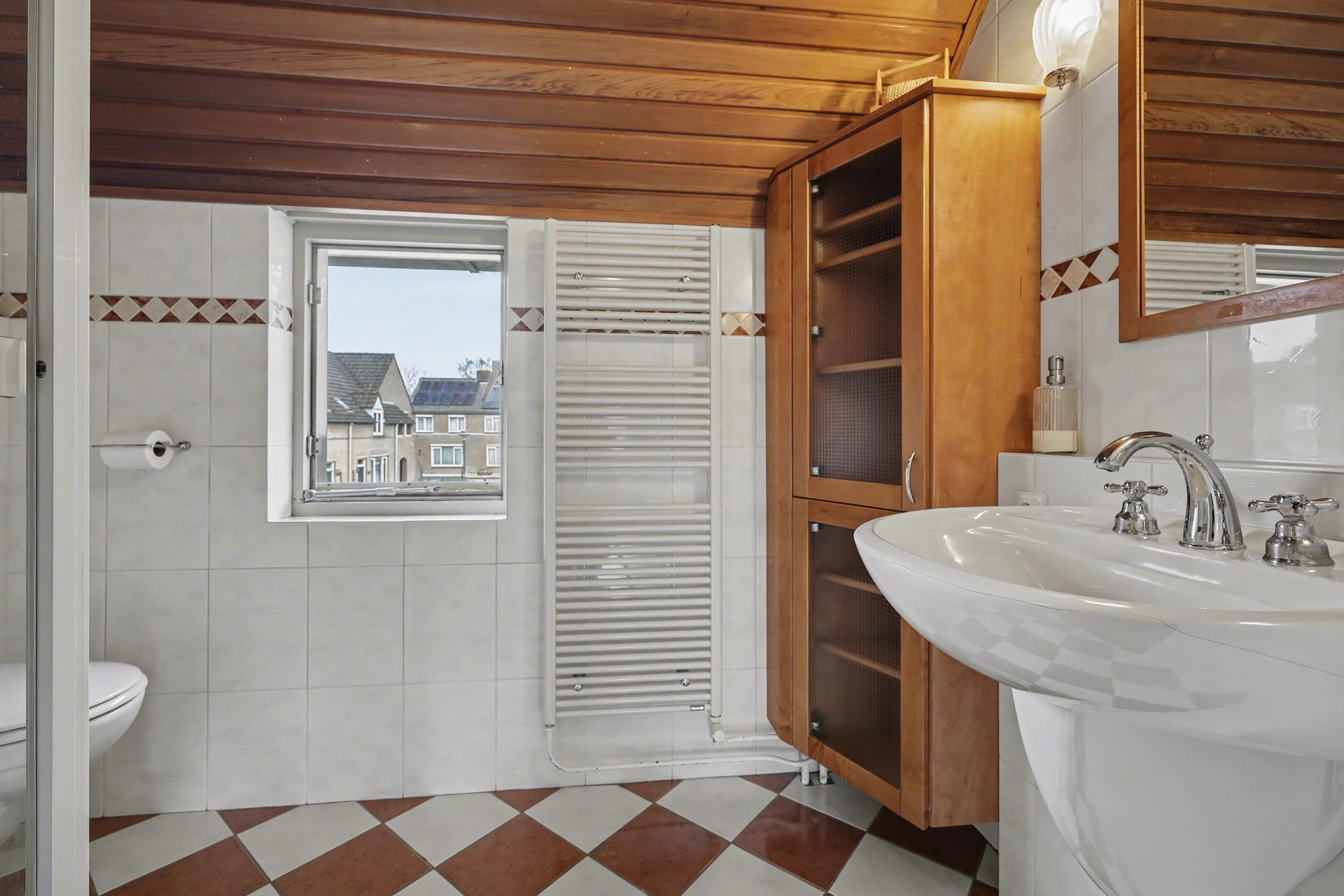 De badkamer is gelegen aan de voorzijde en is volledig betegeld in neutrale kleurtinten. De badkamer is netjes onderhouden en beschikt over een vaste wastafel, een douche, hangcloset en designradiator. De badkamer kan prima worden geventileerd door het raam of mechanisch.