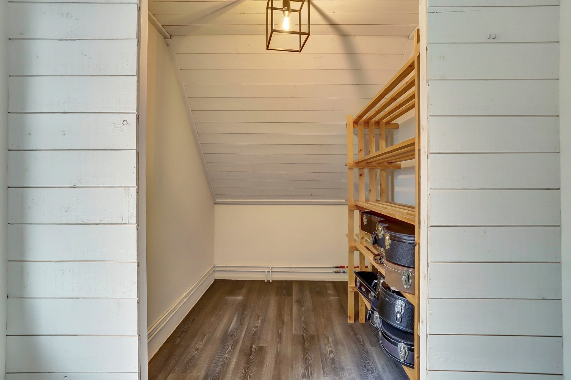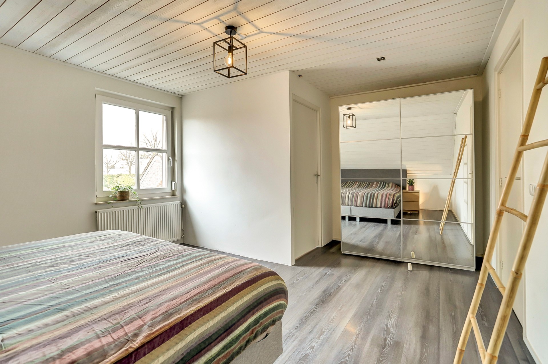 Beide ruimtes zijn afgewerkt met dezelfde nette laminaatvloer, een neutrale wandafwerking en een sfeervol houten schrotenplafond, wat zorgt voor een rustige en samenhangende uitstraling.
