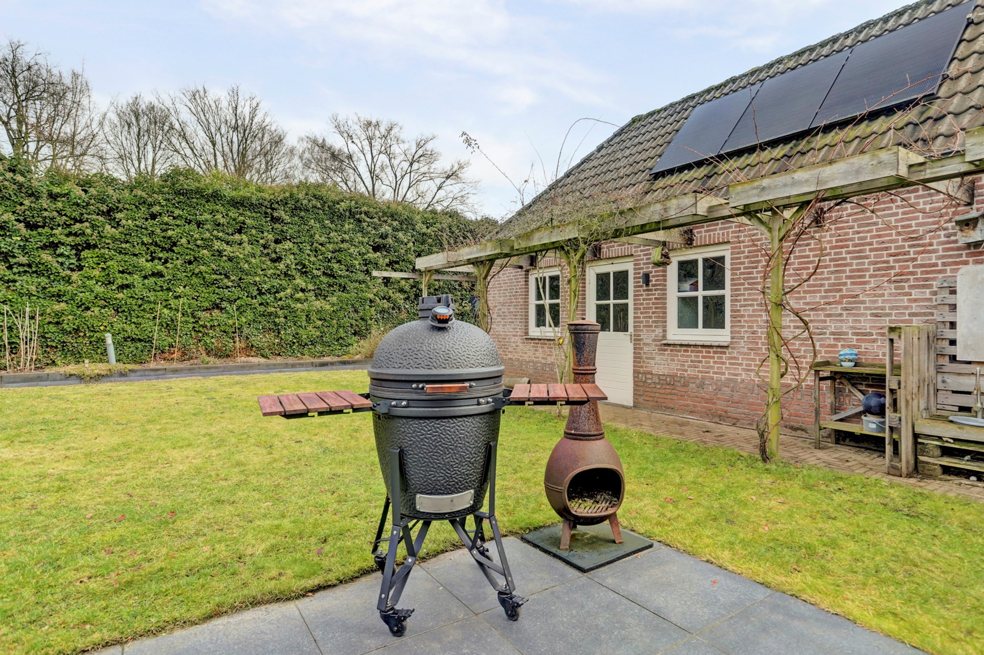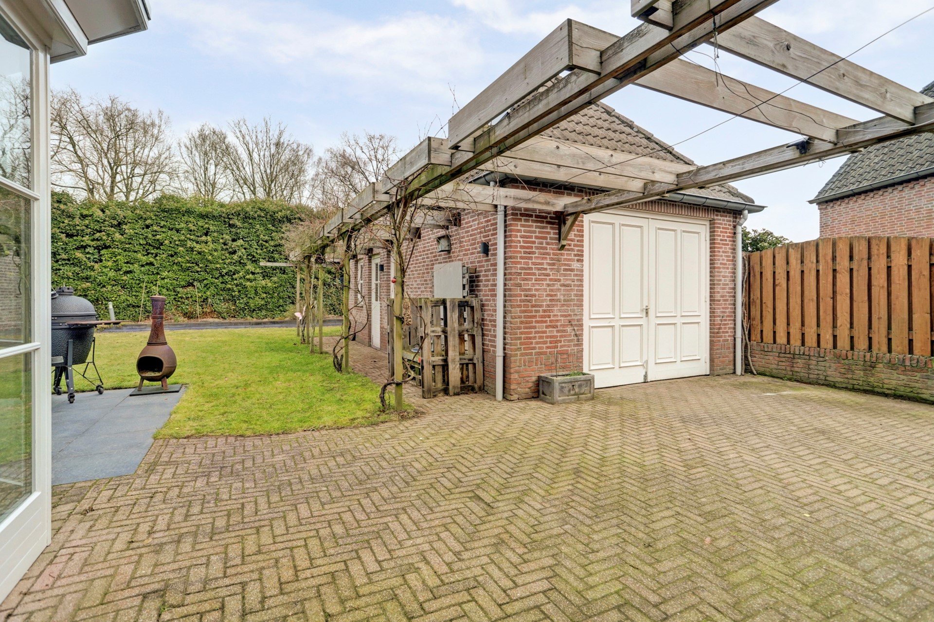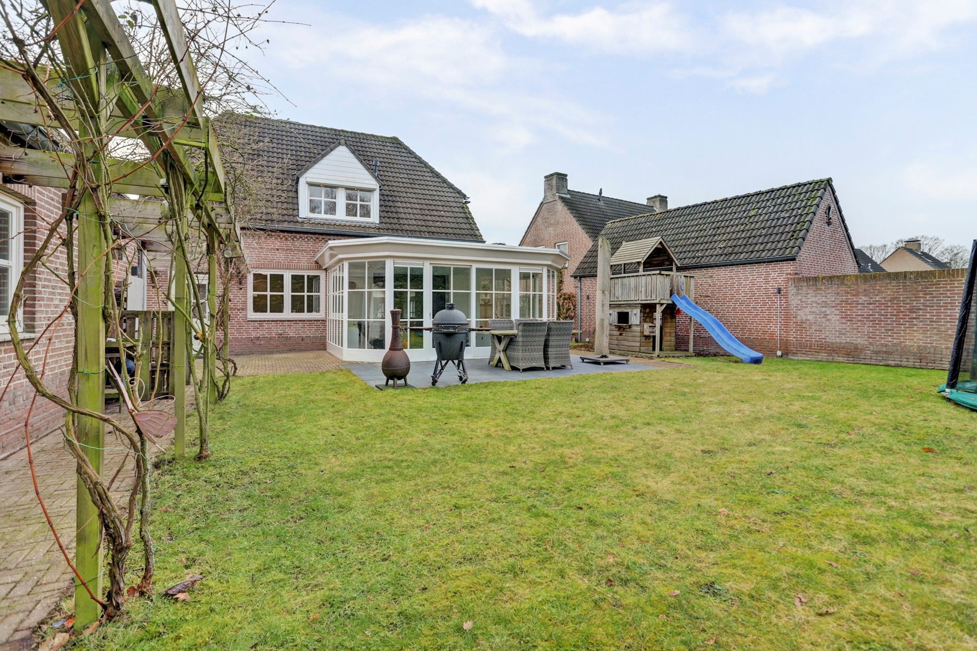 Een looppad leidt je naar het gezellige speelhuis, terwijl een ander pad je onder de pergola met druiven en rozen naar de garage brengt, wat een plaatje moet dat zijn in de zomer!