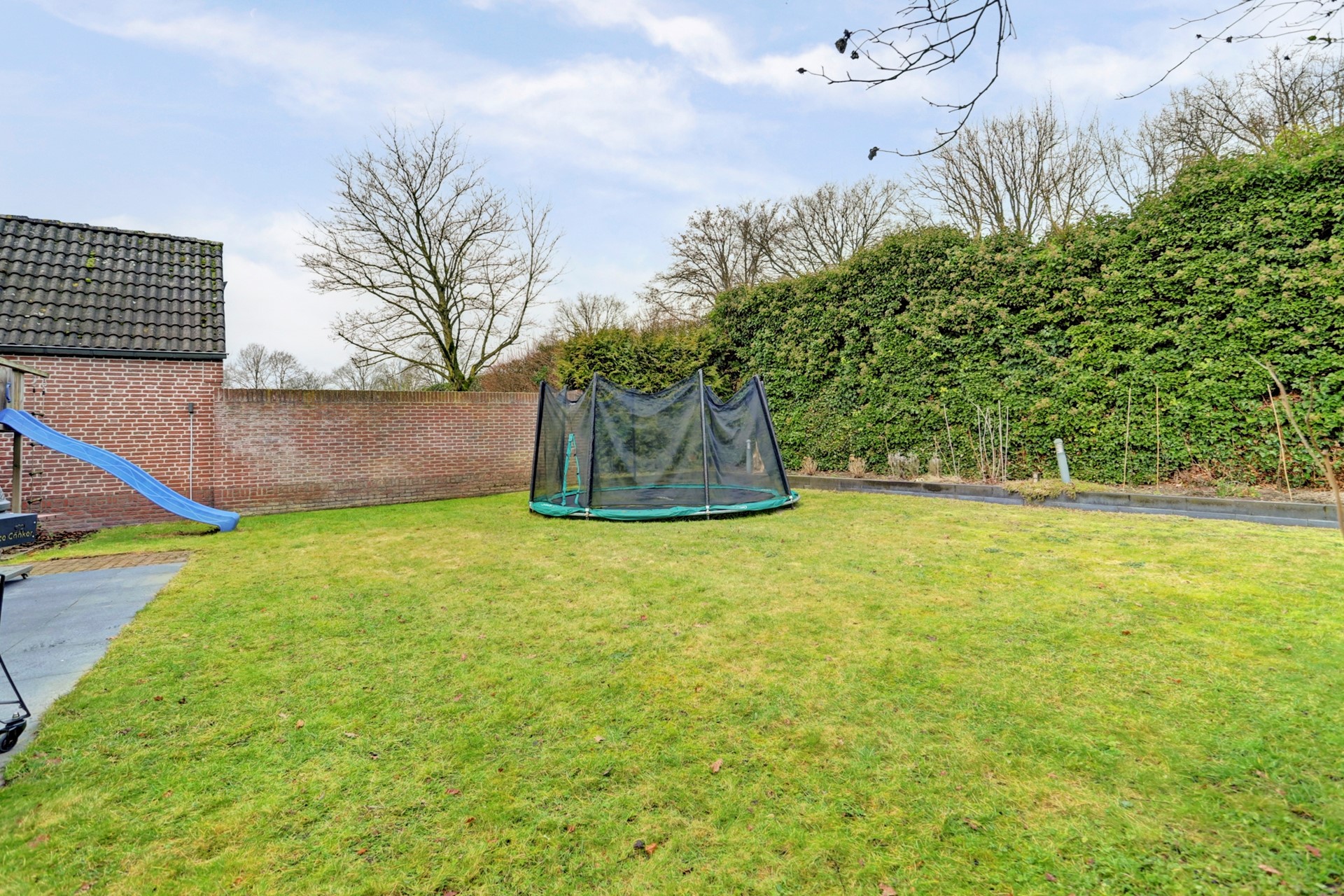 Open de schuifpui in de tuinkamer, of loop via de deur vanuit het achterportaal… en het ultieme buitengevoel omarmt je direct! We sluiten de rondleiding af in de in 2020 vernieuwde tuin, waar de kinderen zich naar hartenlust kunnen uitleven op het ruime gazon, in het speelhuis en op de trampoline, die allemaal achterblijven. Ondertussen genieten de ouders van het zonnige terras, voorzien van stijlvolle keramische tegels, direct achter het huis.