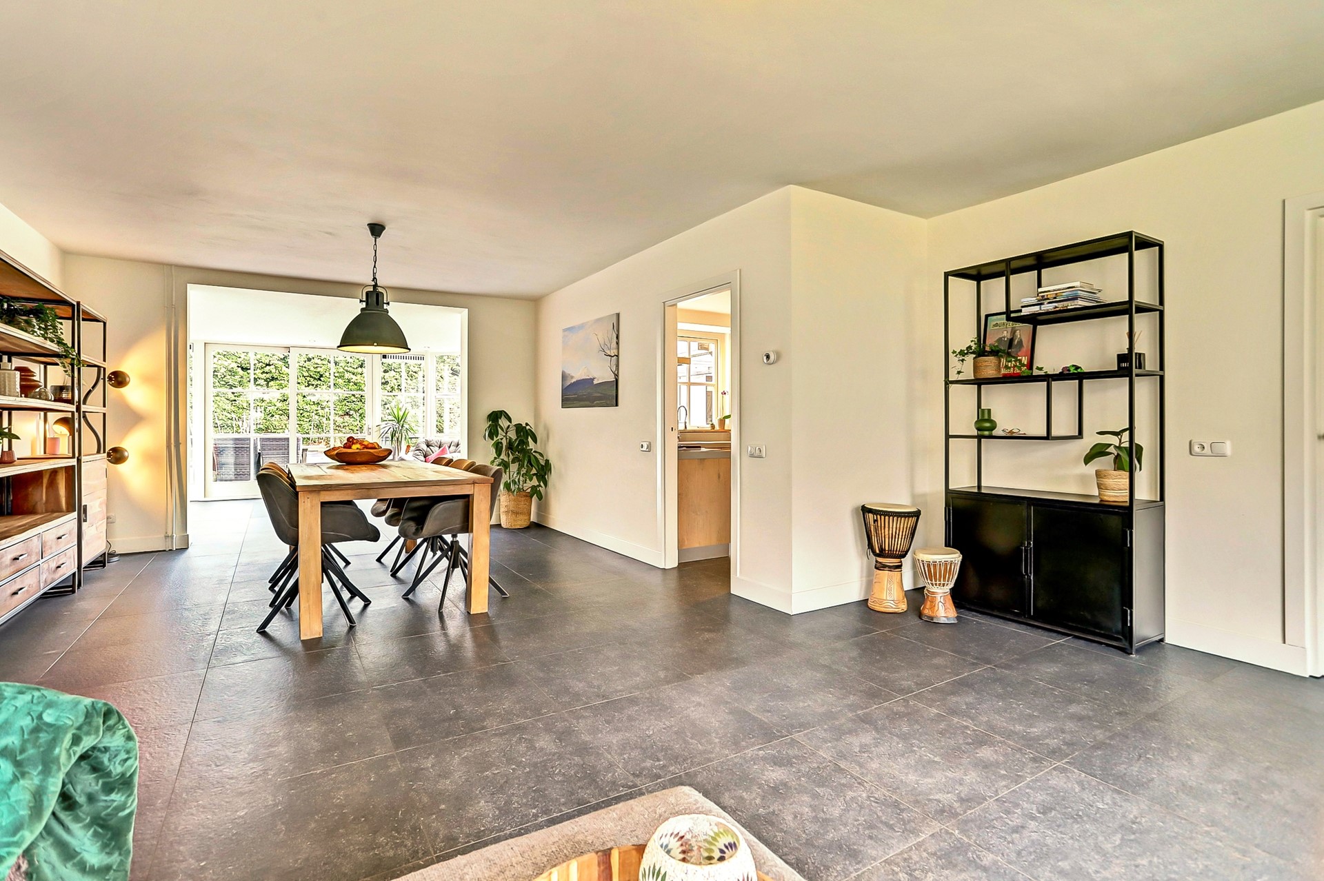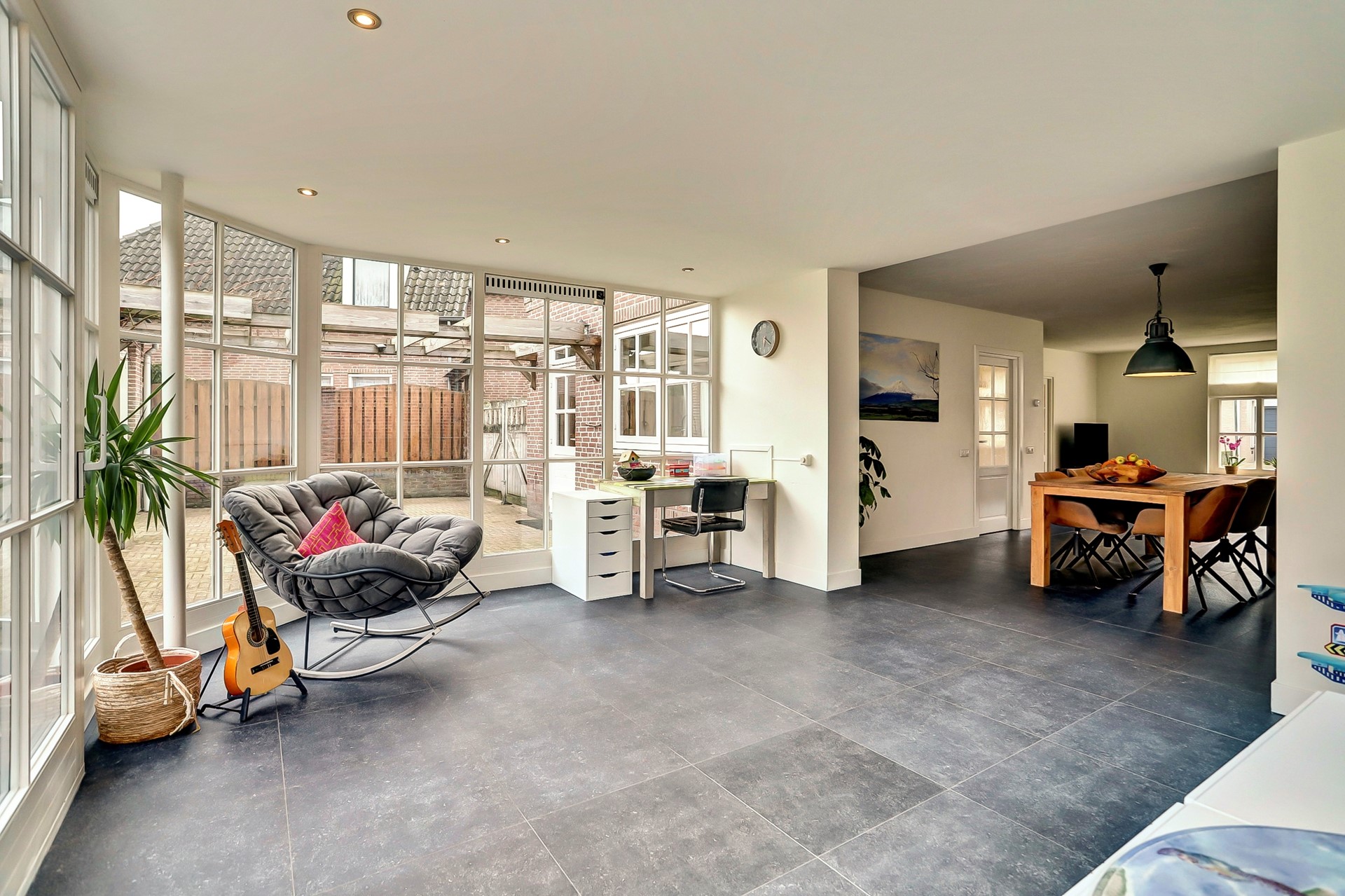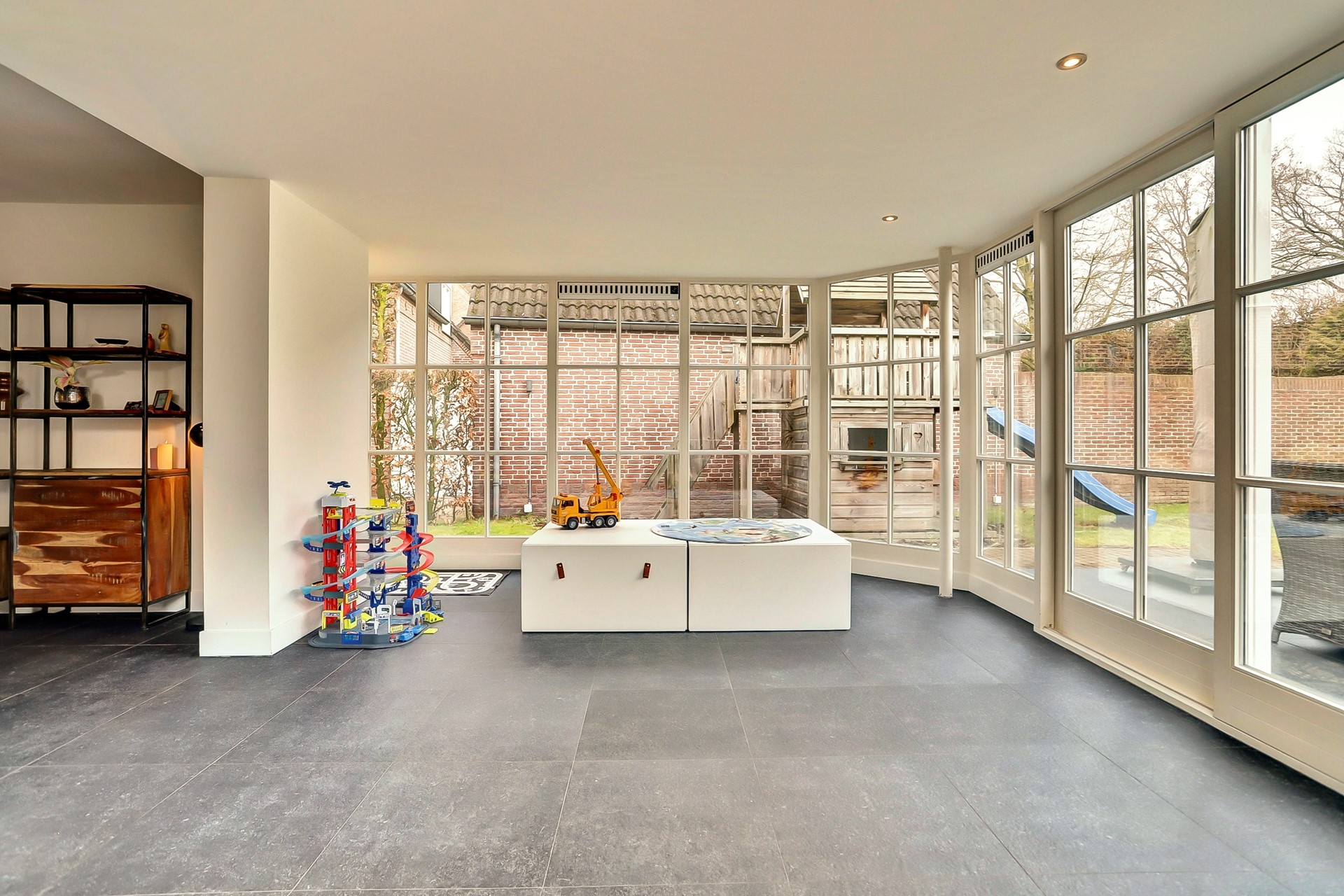 Deze heerlijke tuinkamer is nu ingericht als werk- en speelruimte voor de kids, maar wat een mogelijkheden heeft deze ruimte! Zie jij het al voor je? Een grote eettafel met sfeervolle stoelen, lange avonden tafelen met vrienden en ondertussen genieten van het uitzicht op de tuin. Zodra de zon zich laat zien, schuif je de pui open en vloeien binnen en buiten naadloos in elkaar over. Dit is wonen op z’n best!
