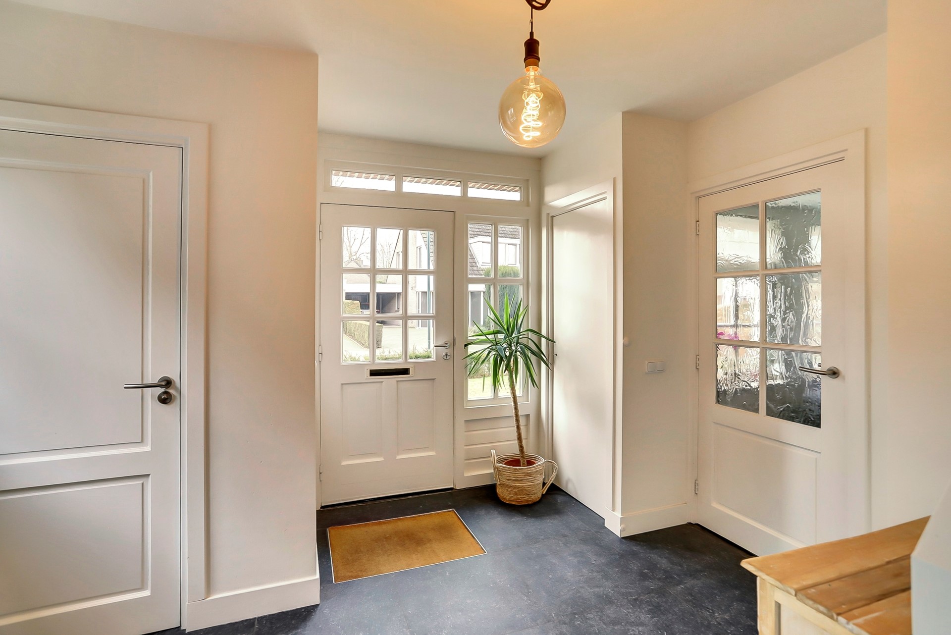 De hal is verder fris en strak afgewerkt, met een tegelvloer voorzien van vloerverwarming en hoge witte plinten. De lichte, strak gestucte wanden en het verzorgde plafond maken het geheel helemaal af!