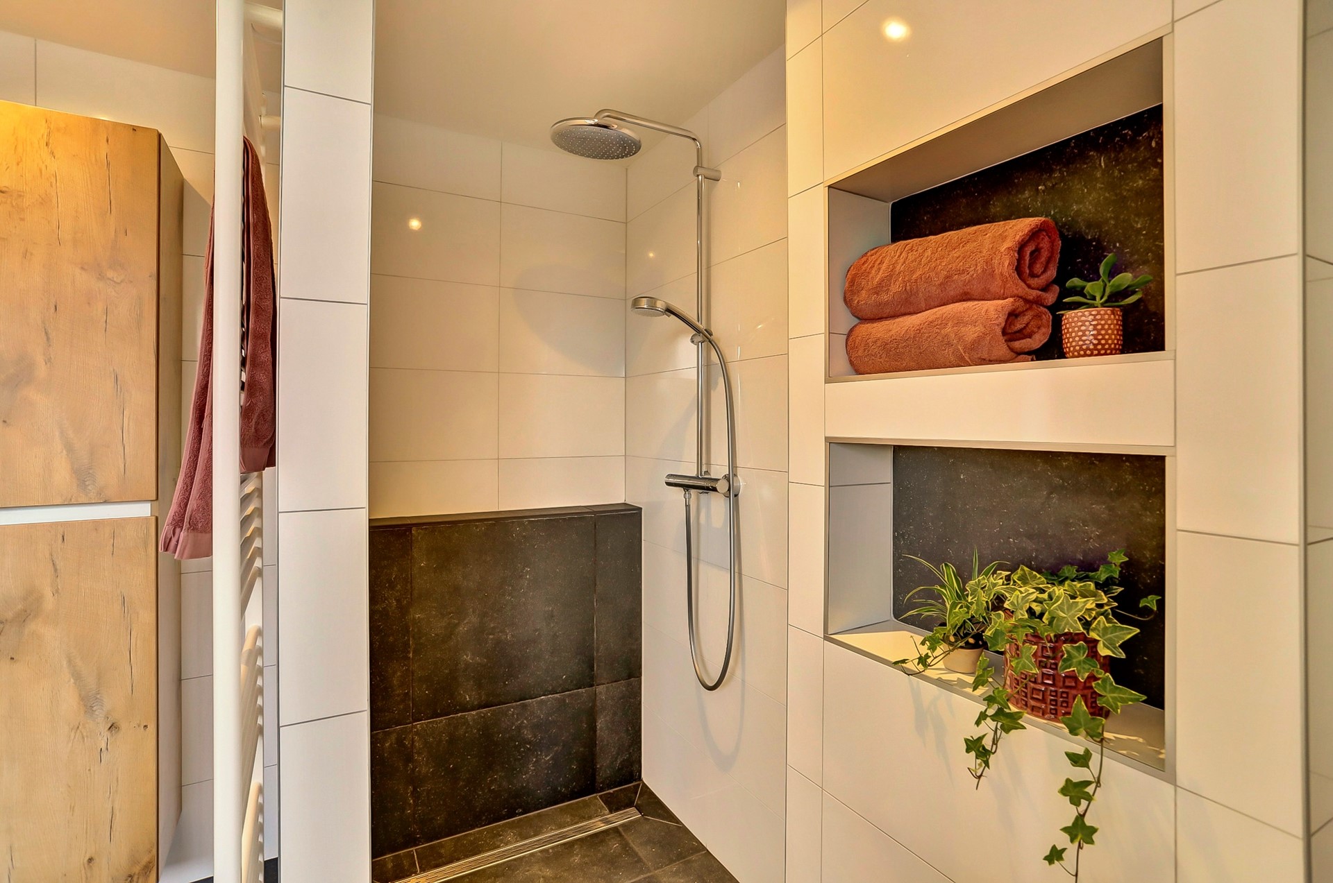 Ook de afwerking is hier tot in de puntjes verzorgd. De tegelvloer is strak en naadloos doorgelegd, gecombineerd met moderne wandafwerking en een strak plafond met inbouwspots die zorgen voor een warme en eigentijdse sfeer.