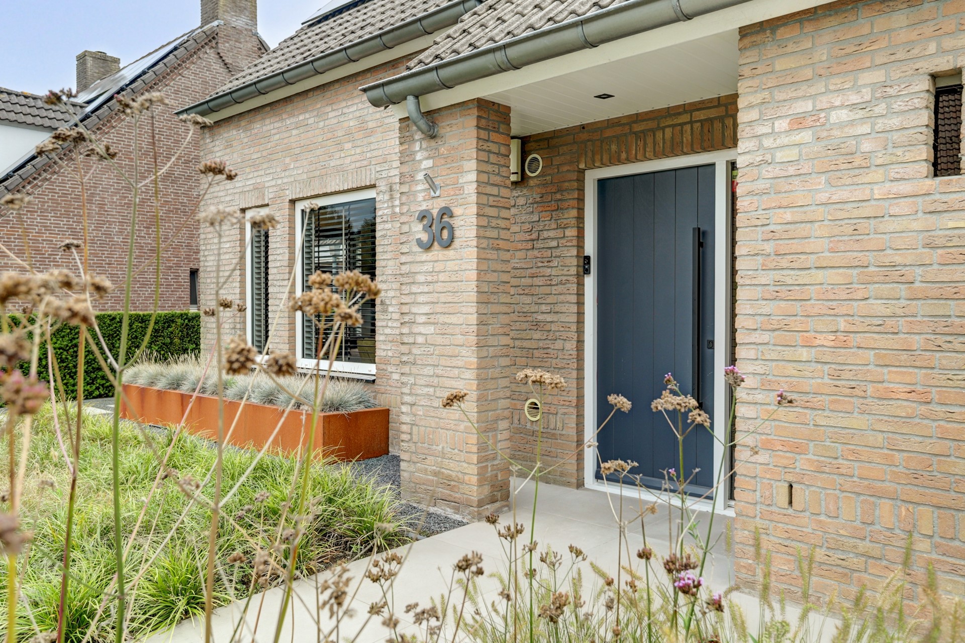De voortuin wordt gekenmerkt door diverse beplanting en bestrating. De ruime oprit aan de rechterzijde van de woning biedt ruimte om meerdere auto's op eigen terrein te parkeren en aan de linkerzijde van de woning bevindt zich de achterom.