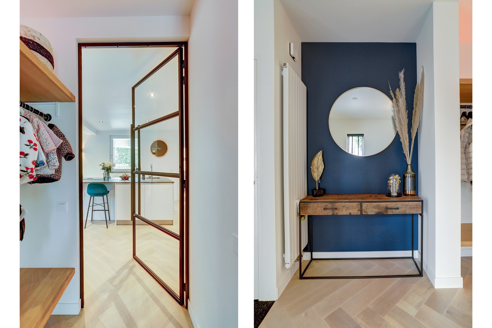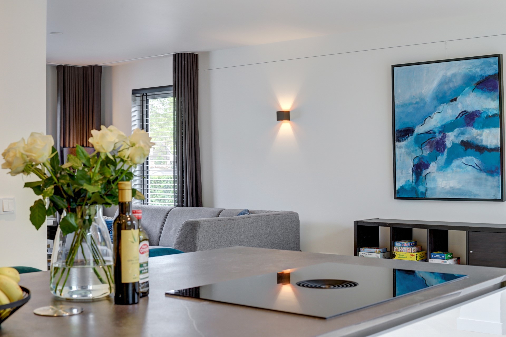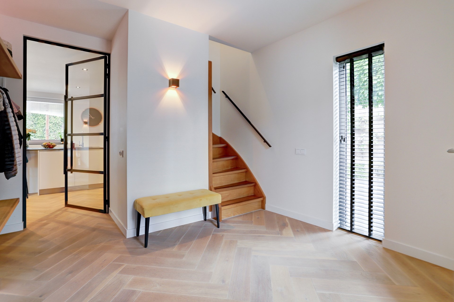 De afwerking is ook om door een ringetje te halen: een stijlvolle houten visgraat vloer met vloerverwarming, strak gestucte wanden en plafonds, en sfeervolle up- and-downlight verlichting aan de muur. Alles klopt hier. Dit is zo’n ruimte waar je binnenkomt en denkt: ja, hier wil ik wonen.