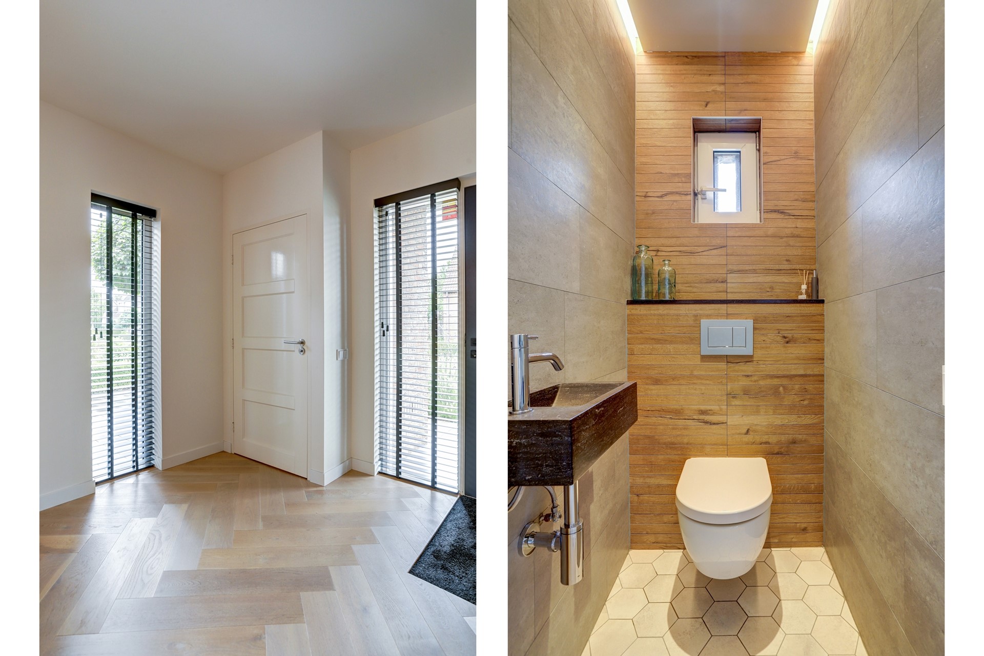Bij aankomst bij de woning parkeer je de auto op je eigen oprit. Liever achterom? Aan de linkerzijde van de woning is een poort met toegang tot de achtertuin. Middels looppad in de keurig aangelegde voortuin, bereik je de voordeur van deze prachtige woning. Kom snel verder en ontdek wat deze woning allemaal te bieden heeft! Na het openen van de voordeur voel je direct de royale ruimte en sfeer in de woning. De entree is royaal opgezet, beschikt over een moderne houten vloer (multiplank) in visgraat design met vloerverwarming, gestucte wanden- en plafonds. De hal geeft toegang tot de eerste verdieping, een volledig betegeld toilet met hangcloset en fonteintje, de meterkast en het woongedeelte.
