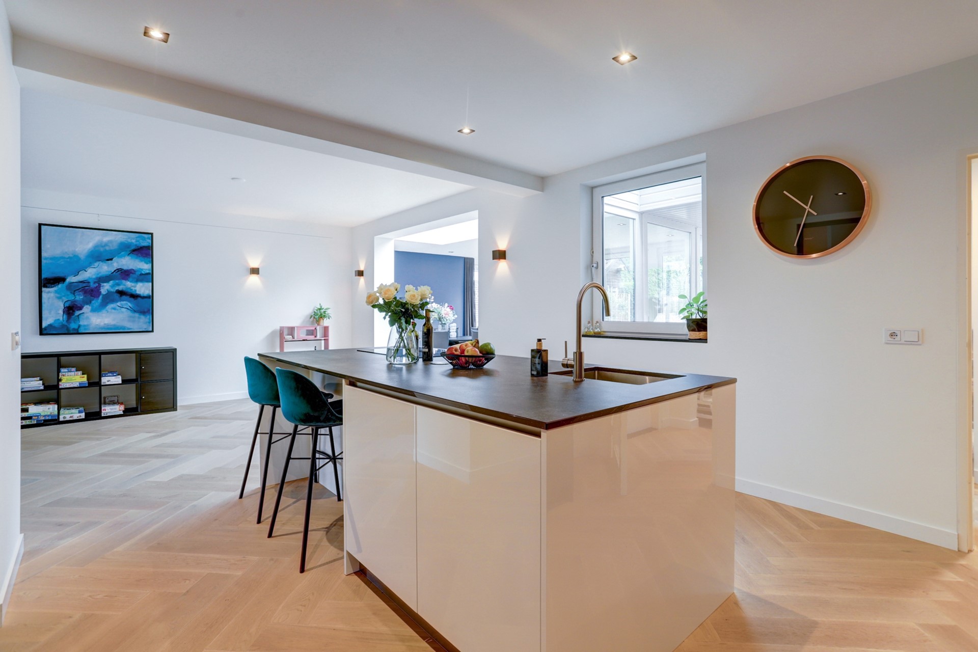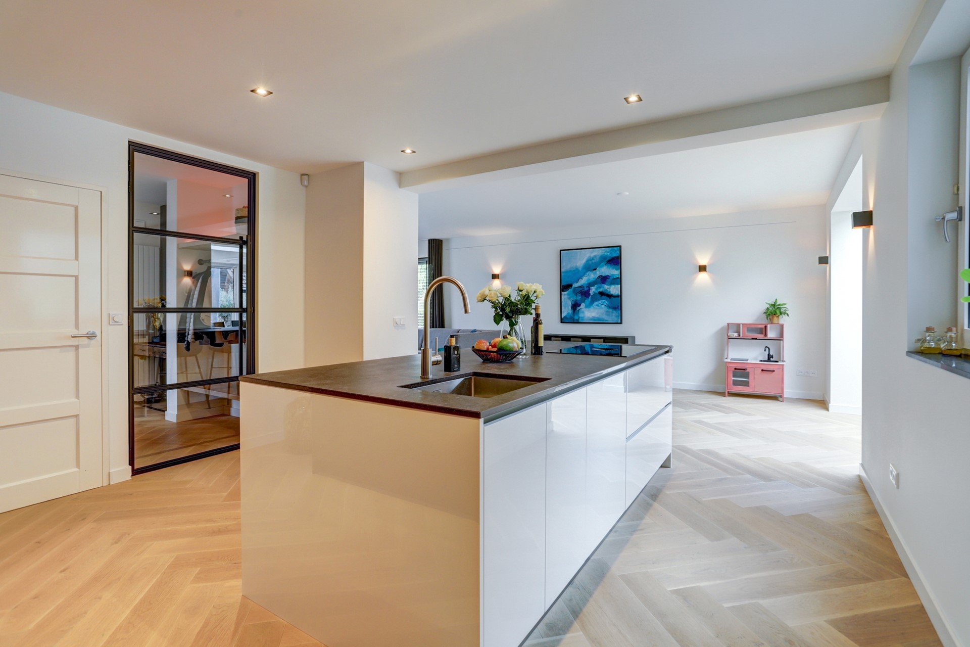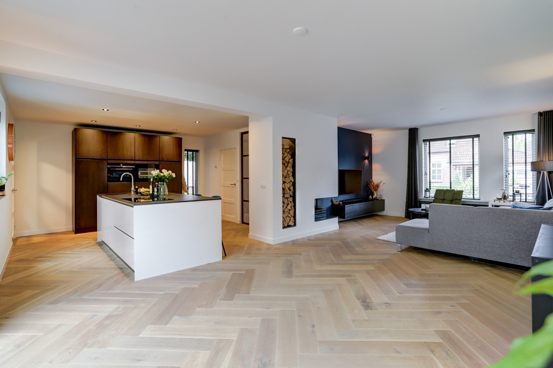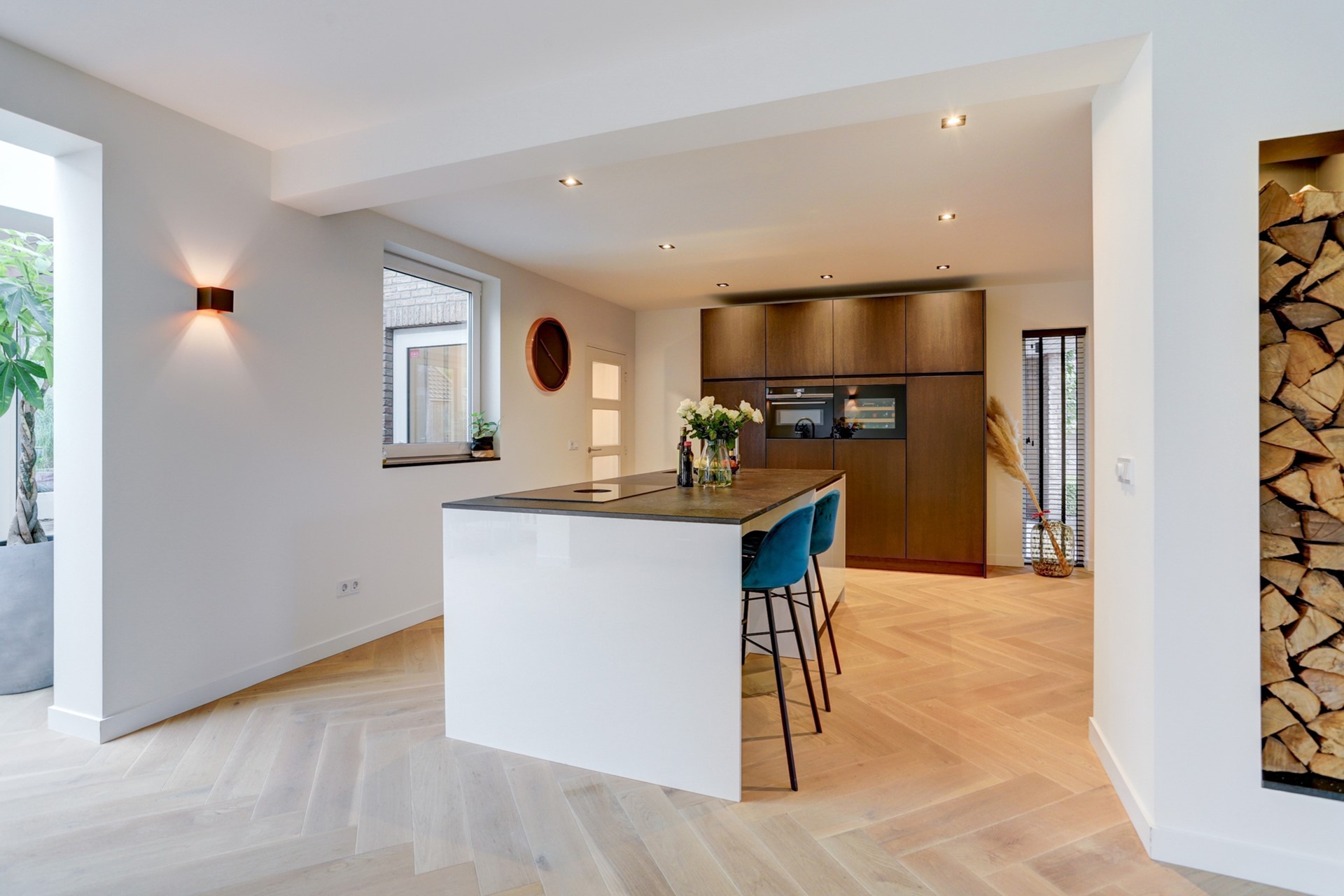 Binnen stap je een zee van ruimte in. De woonkamer loopt door in een sfeervolle zitkamer – perfect voor lange avonden met vrienden of een goed boek. De luxe open keuken met kookeiland is een echte eyecatcher, en de praktische bijkeuken, inpandige garage en berging maken het plaatje compleet.