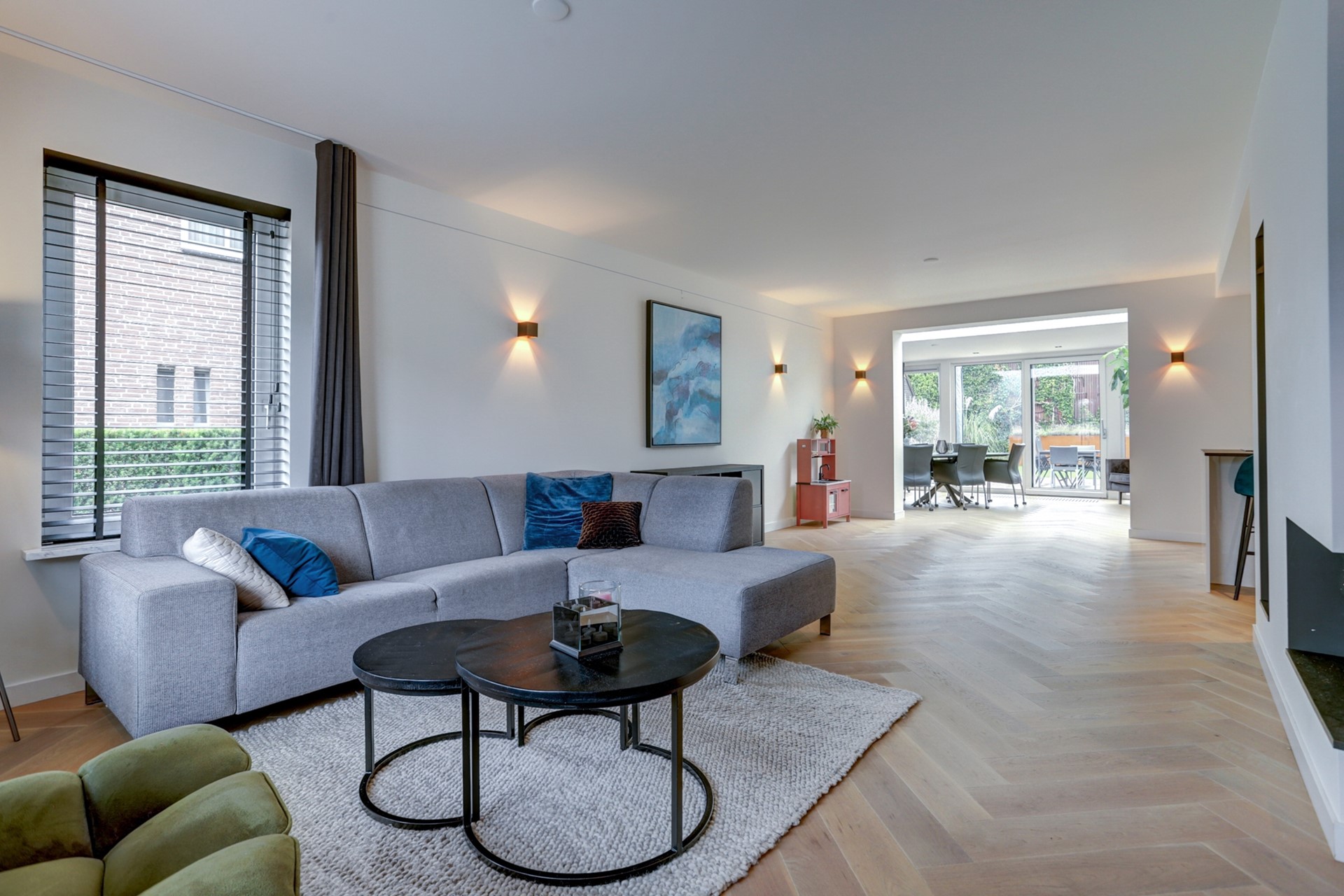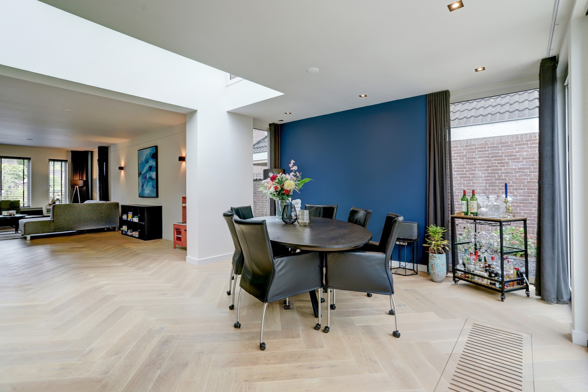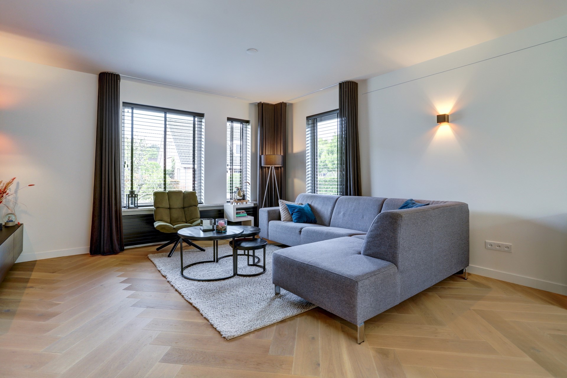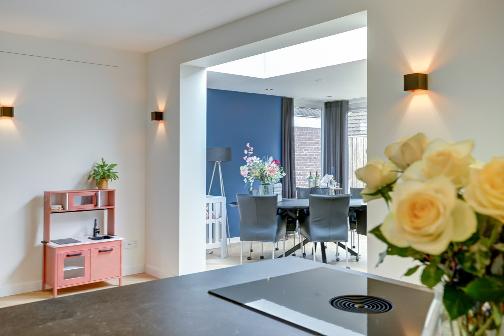 Binnen stap je een zee van ruimte in. De woonkamer loopt door in een sfeervolle zitkamer – perfect voor lange avonden met vrienden of een goed boek. De luxe open keuken met kookeiland is een echte eyecatcher, en de praktische bijkeuken, inpandige garage en berging maken het plaatje compleet.