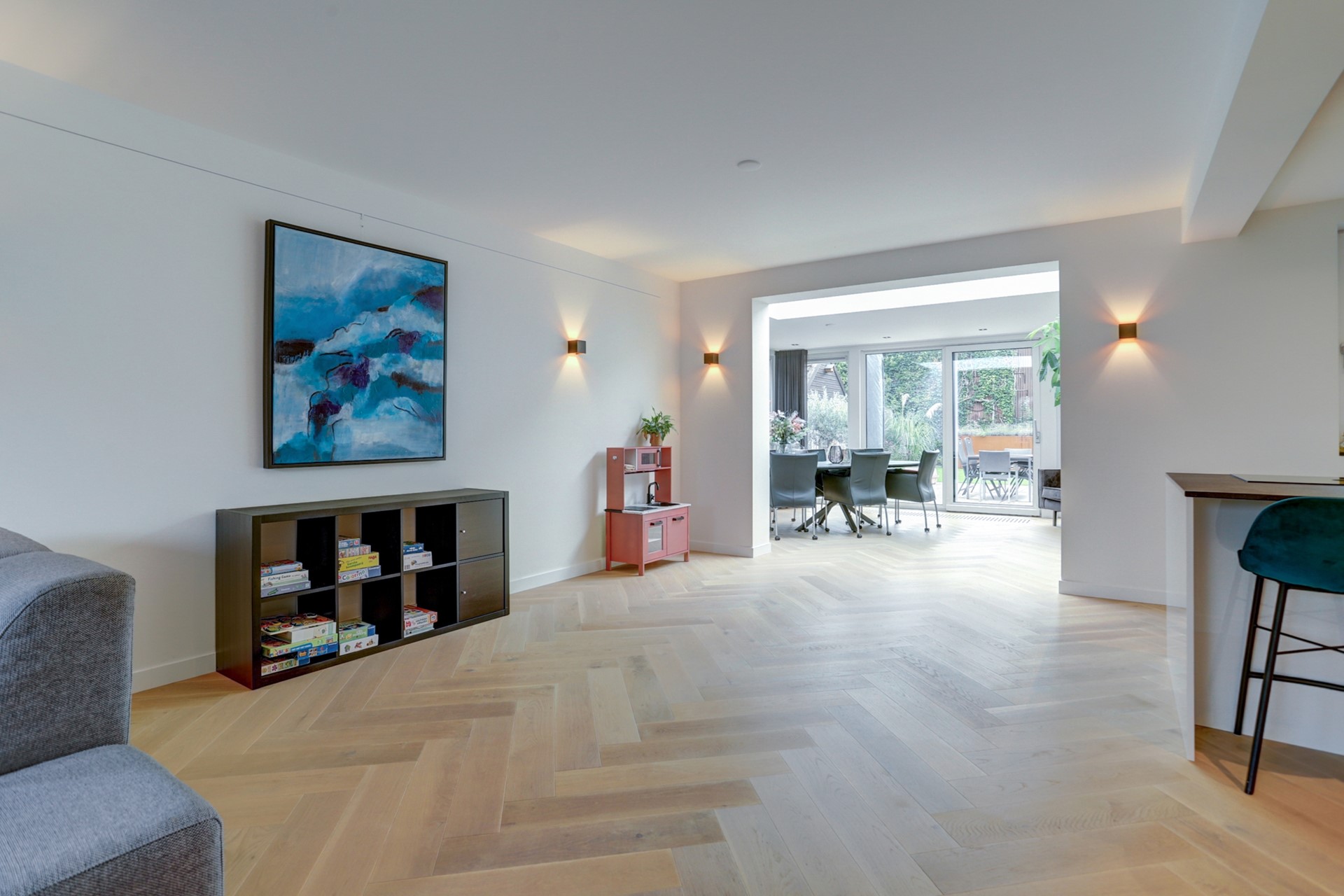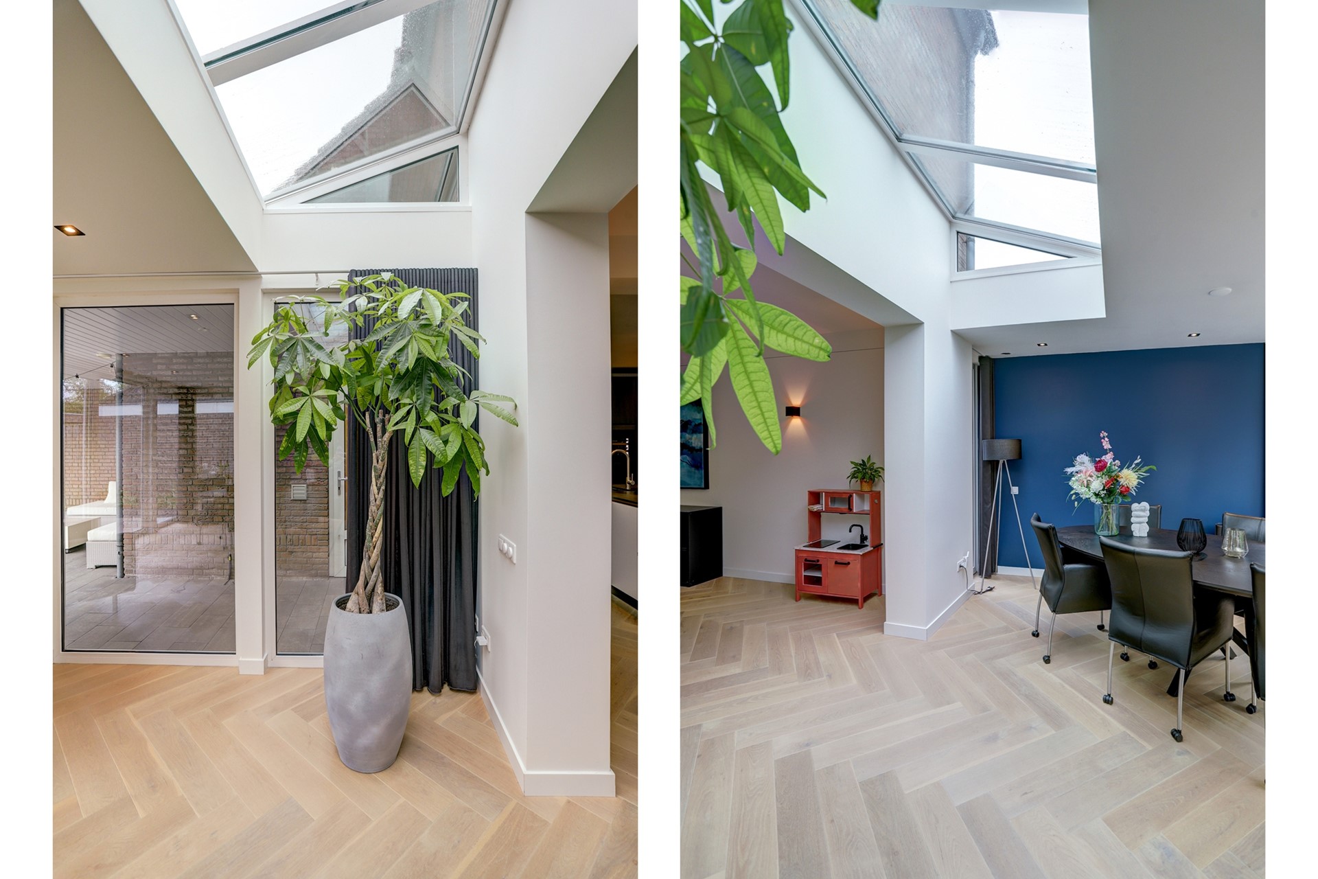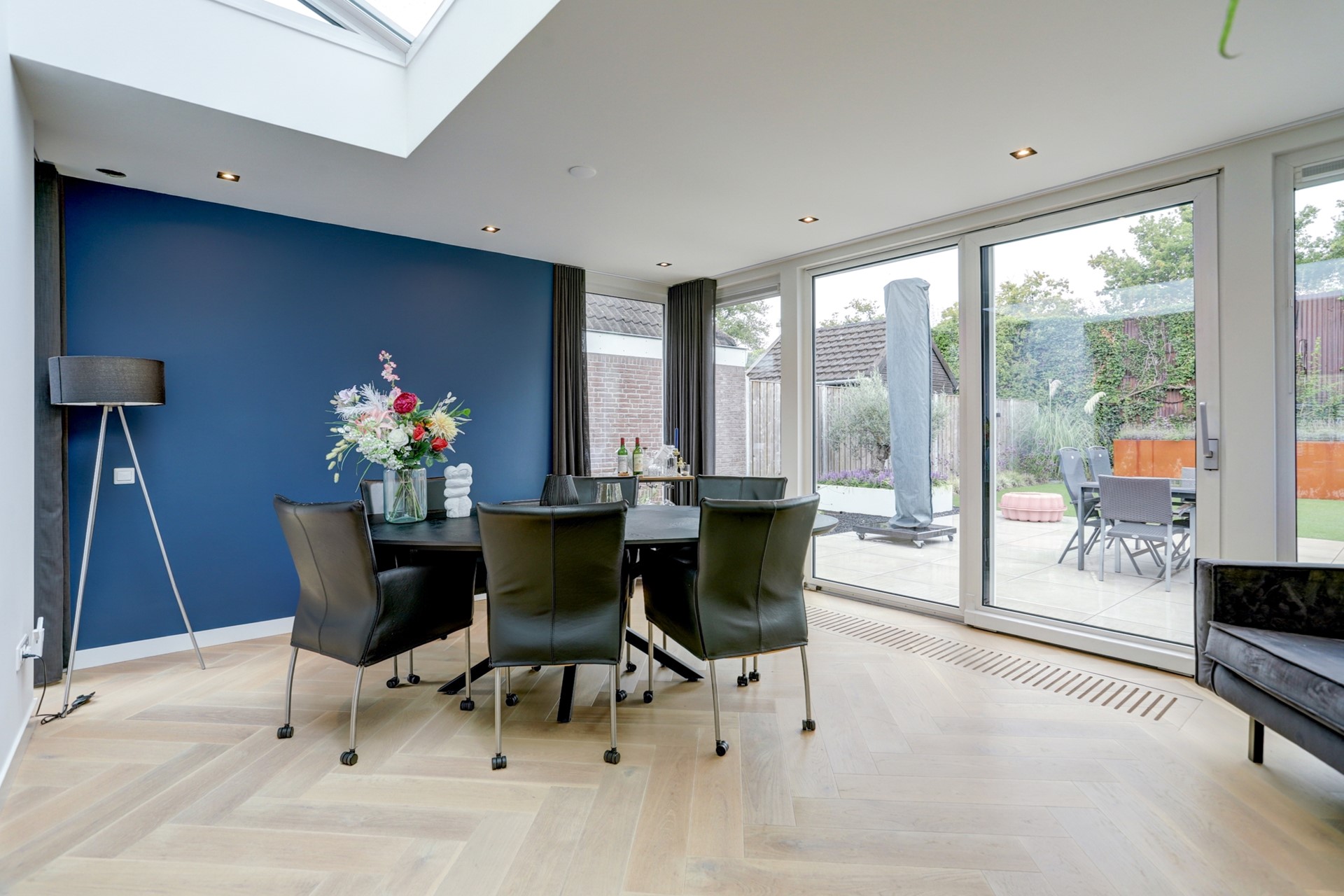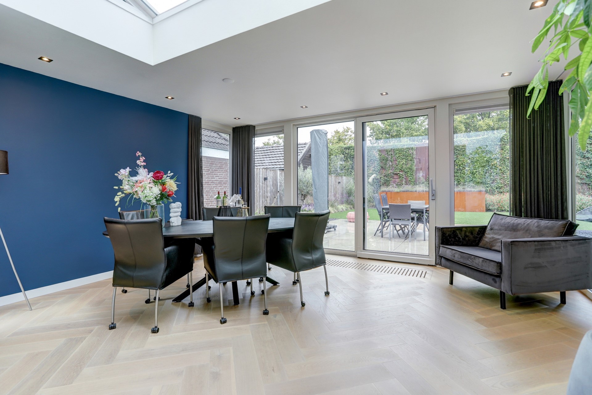 En dan… de fantastische zitkamer in de aanbouw. Dit is écht een pareltje! Dankzij de grote raampartijen rondom, een lichtstraat én een schuifpui stroomt het daglicht van alle kanten binnen en heb je direct een prachtig uitzicht over de fraai aangelegde achtertuin. Dit is een plek waar jij heerlijke avonden doorbrengt samen met vrienden en familie, een gezellige borrel of een potje kaarten.