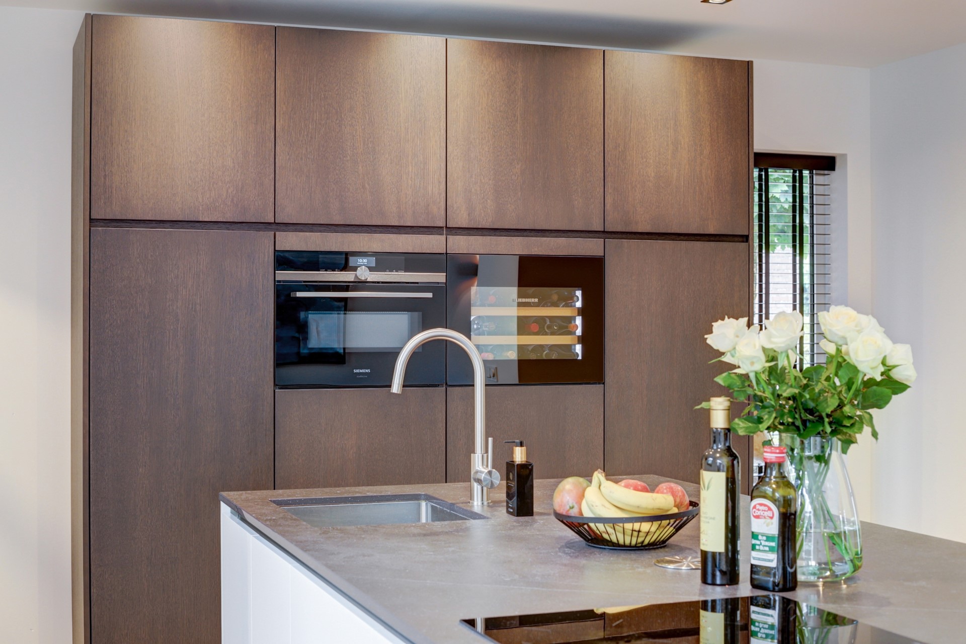 Uiteraard is de keuken van alle gemakken voorzien: een koelkast, vaatwasser, combi-oven (allen Siemens) en een Bora inductiekookplaat met geïntegreerd afzuigsysteem. En dan… de wijnklimaatkast! Altijd een wijntje op perfecte temperatuur bij de hand – proost!