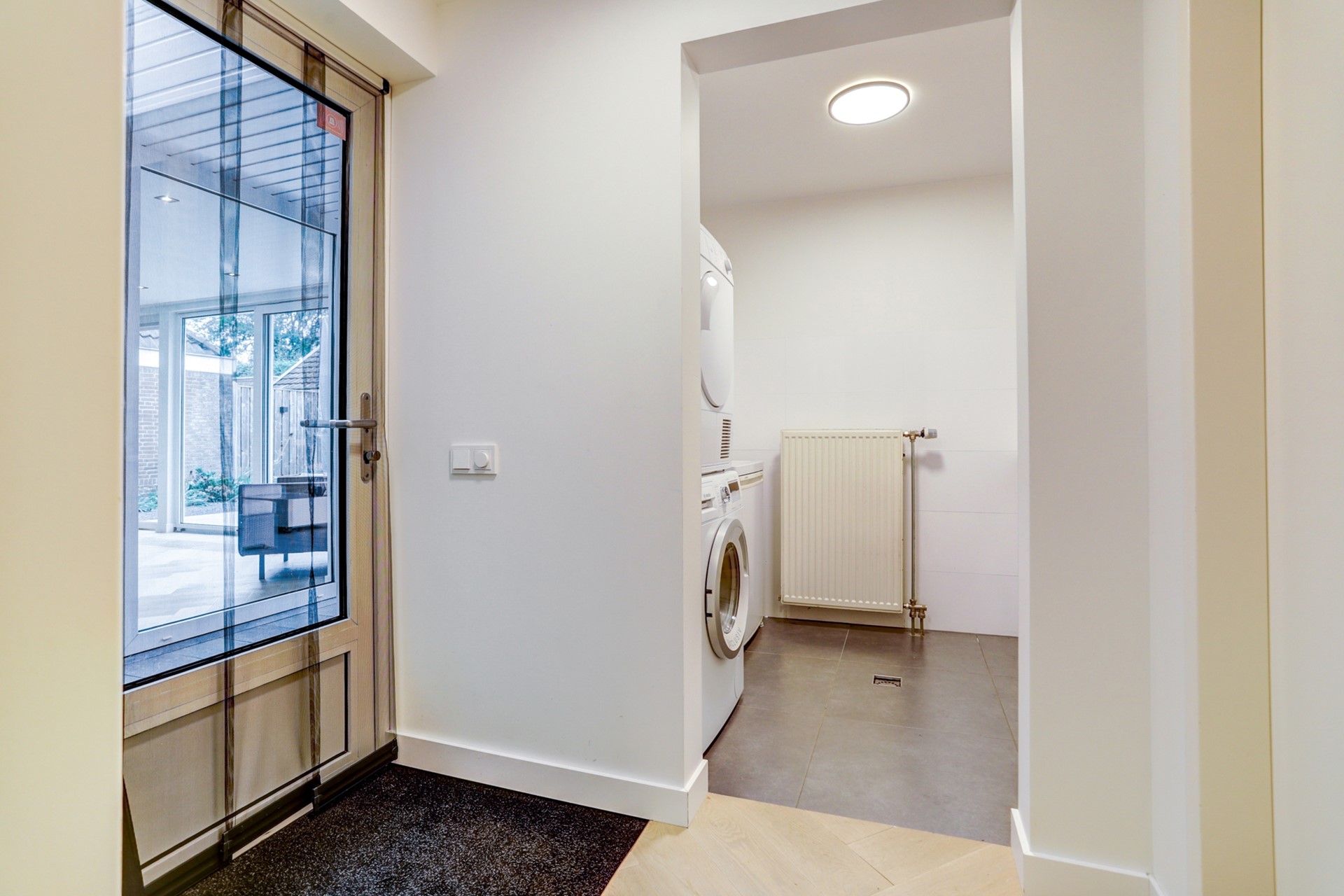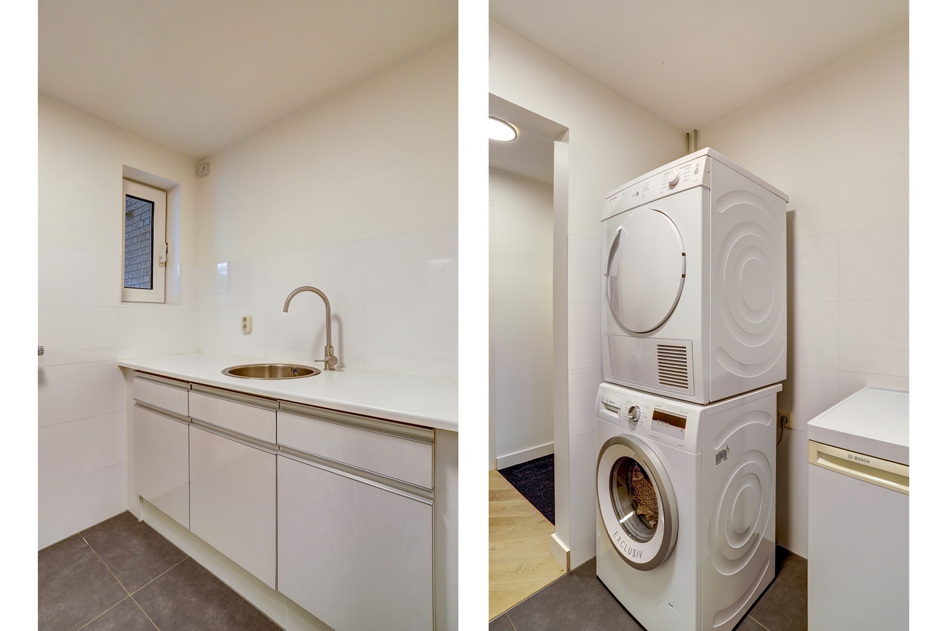 De halfhoog betegelde wasruimte is zeer praktisch en functioneel in gebruik. Zo zijn hier de aansluitingen voor het witgoed, een wasbak en diverse kastruimte aanwezig.