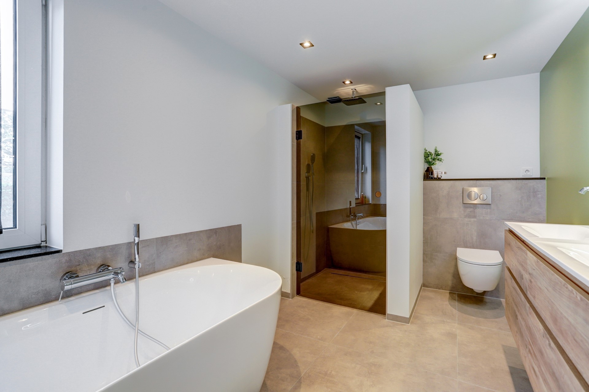 Een heerlijk ligbad, ideaal voor een ontspannen moment of de kinderen in bad doen. Een royale inloopdouche voorzien van rookglas, een hangcloset en een royaal badmeubel met dubbele wasbak en mengkranen. Deze badkamer biedt dan ook volop ruimte voor het hele gezin!