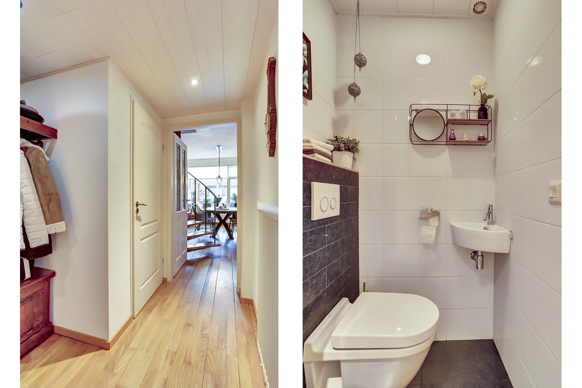 Middels looppad bereik je de voordeur van de woning. De entreehal is voorzien van een prachtige houtenvloer, gestuukte wanden en MDF plafond met inbouwspots. De royale hal beschikt over een meterkast, een garderobenis en modern toilet v.v. hangcloset en fonteintje. Vanuit de hal krijg je toegang tot de woonkamer.