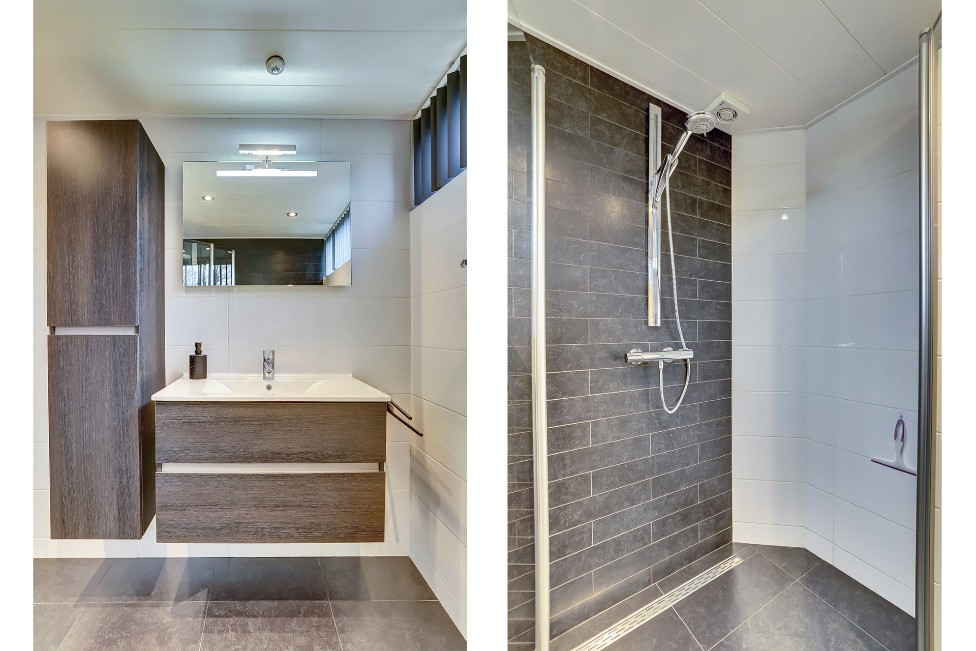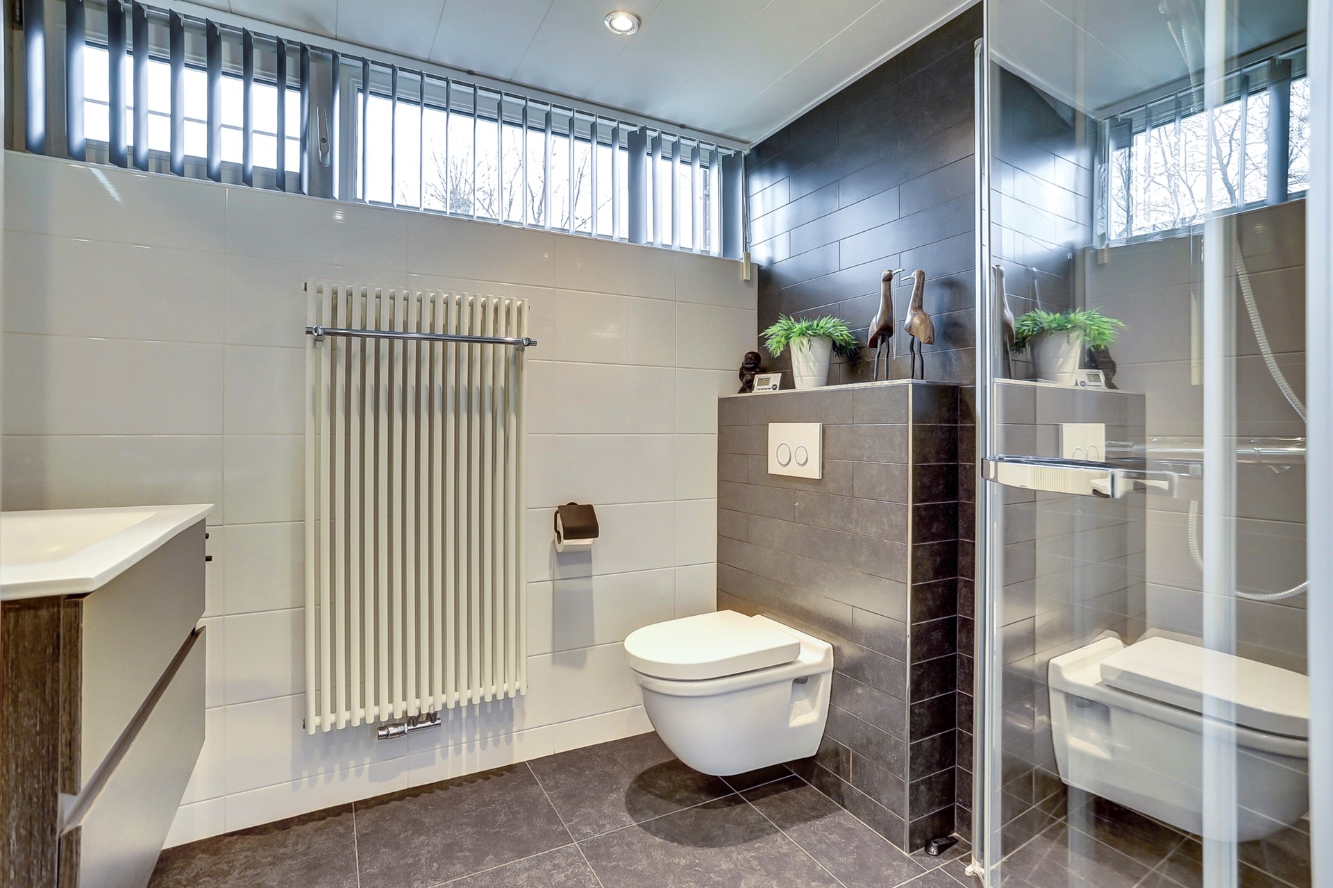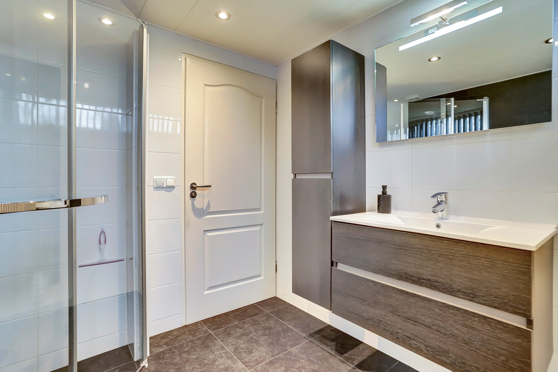 De badkamer is gelegen aan de voorzijde en is volledig betegeld in neutrale kleurtinten. De badkamer beschikt over vloervewarming, een badmeubel met wastafel, grote inloopdouche met praktische douchewand, hangcloset en designradiator. De badkamer kan prima worden geventileerd door het raam of mechanisch.