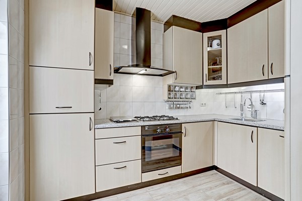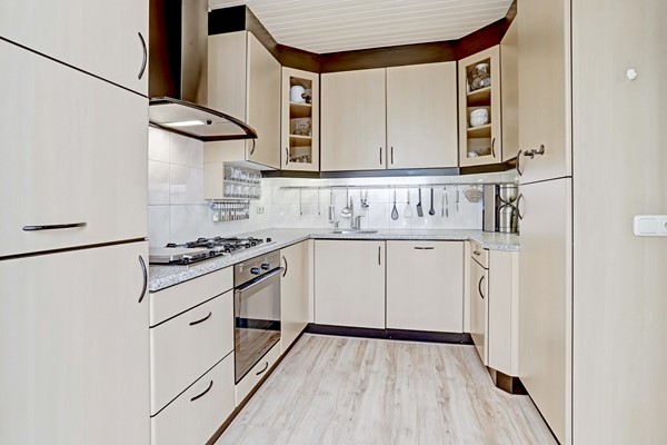 De royale inbouwkeuken in U-opstelling is goed onderhouden en beschikt over neutrale kleurtinten. De inbouwkeuken beschikt over alle denkbare apparatuur waaronder een gaskookplaat, koelkast, afzuigkap, vaatwasser, ingebouwde frituurpan en combi-oven en meer dan voldoende bergruimte.