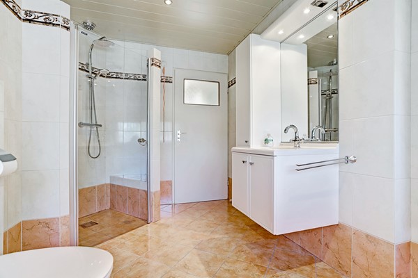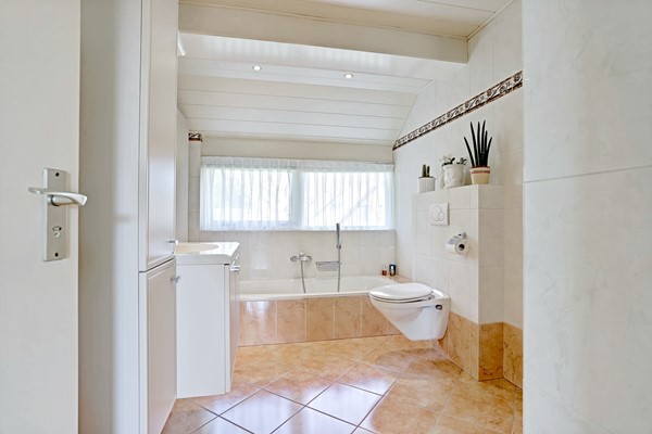 De badkamer is gelegen aan de voorzijde en is volledig betegeld in neutrale kleurtinten. De badkamer is uitgebouwd aan de voorzijde en beschikt daardoor over een badmeubel met wastafel, een ligbad, douche en hangcloset. De badkamer is verder voorzien van vloerverwarming en een grote radiator.