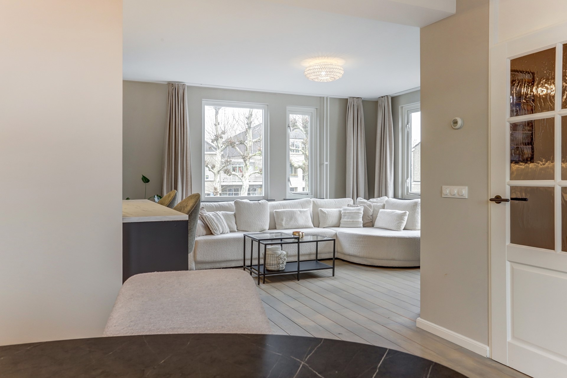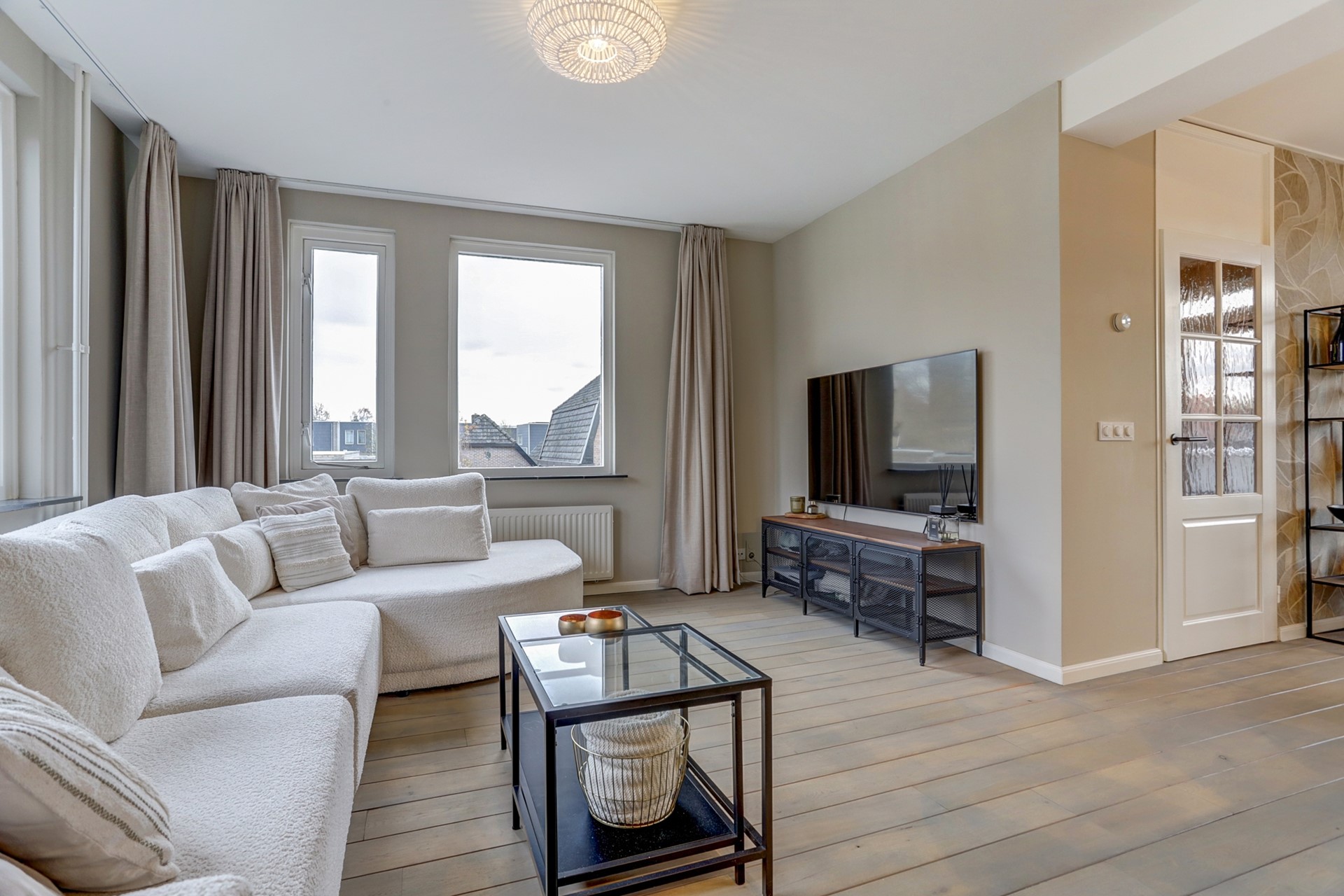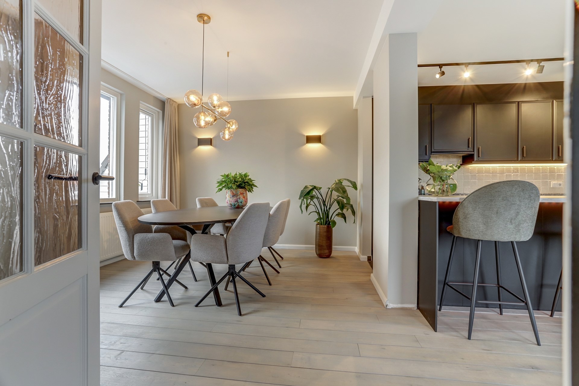 De woonkamer is een heerlijke leefruimte met een uitnodigende zit- en eethoek, rijk aan natuurlijk daglicht. De prachtige eikenhouten vloer vormt een warme basis terwijl de strak gestucte wanden in 2024 nog zijn voorzien van een frisse schilderbeurt in rustige taupe tinten. Dit zorgt voor een modern en stijlvol geheel met een huiselijke sfeer.
