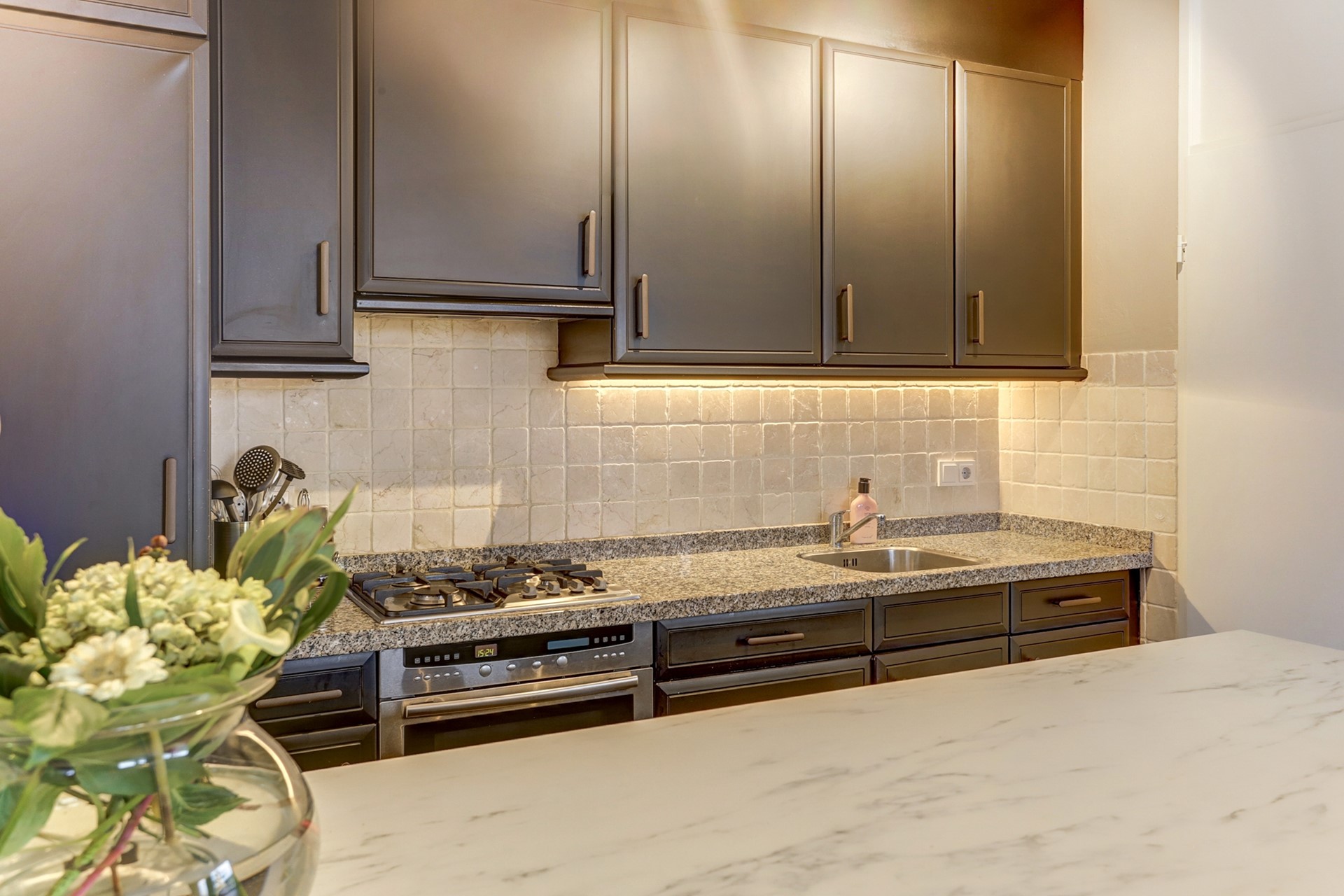 De open keuken in wandopstelling beschikt over neutrale kleurtinten. Door het het weghalen van een eerder aanwezige muur hier kent de keuken extra veel ruimte. Deze verbetering is erg netjes, in plaats hiervan is er een extra aanrechtblad met bar toegevoegd! Een heerlijke plek om te ontbijten borrelen of koken met een wijntje.