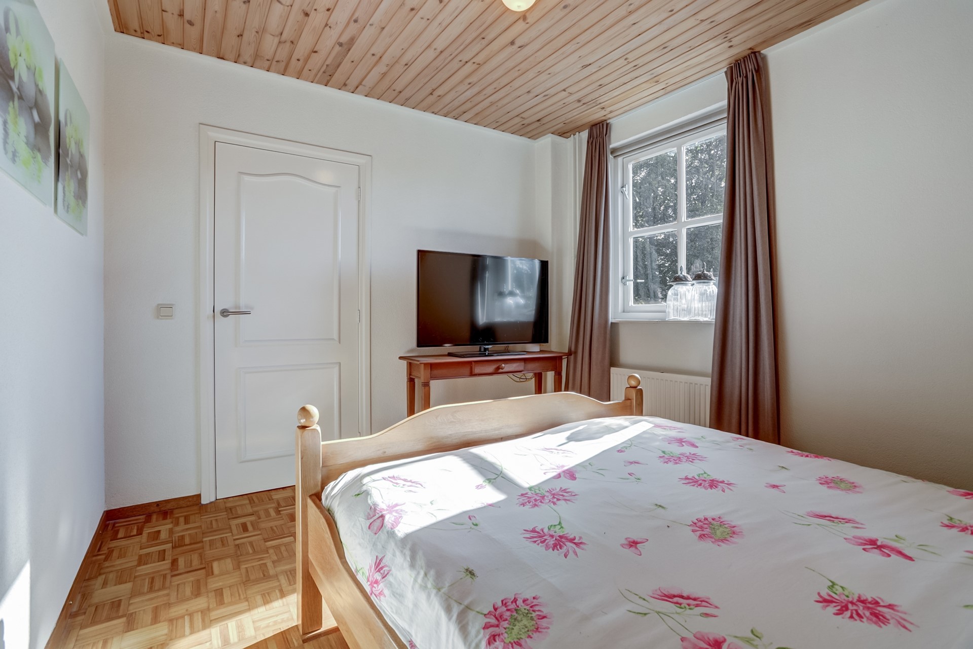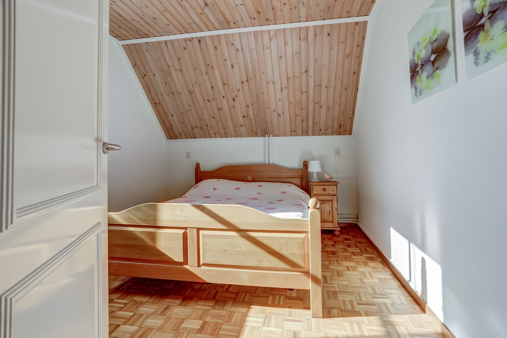 Slaapkamer twee aan de achterzijde straalt warmte en rust uit en heeft volop plek voor een tweepersoonsbed. Het houten schrotenplafond en de blokparketvloer geven de ruimte karakter, terwijl de neutrale wanden zorgen voor een rustige basis. En dan is er slaapkamer drie aan de voorzijde, gelijkwaardig afgewerkt en voorzien van een fijne dakkapel die zorgt voor extra licht en ruimte.