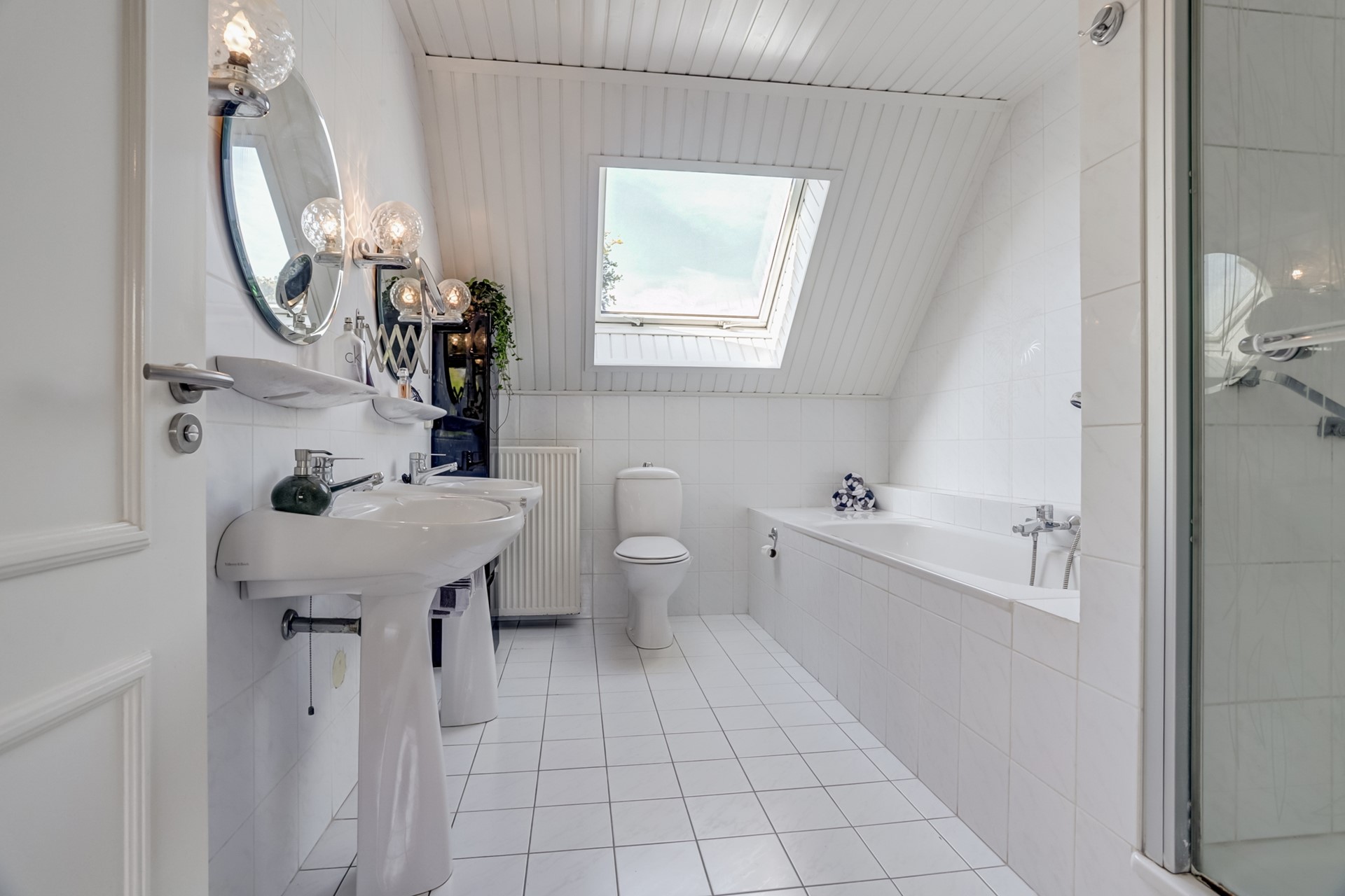 Wat een ruimte: heerlijk licht en praktisch ingedeeld! De badkamer is tijdloos en neutraal wit uitgevoerd, waardoor je er alle kanten mee op kunt. Links vind je een dubbele wastafel met twee plancets en spiegels. Recht vooruit ligt het toilet, terwijl rechts een ligbad en douchecabine voor optimaal comfort zorgen. Dankzij het grote dakvenster is er volop natuurlijke ventilatie en voor de warmte is er een radiator aanwezig.