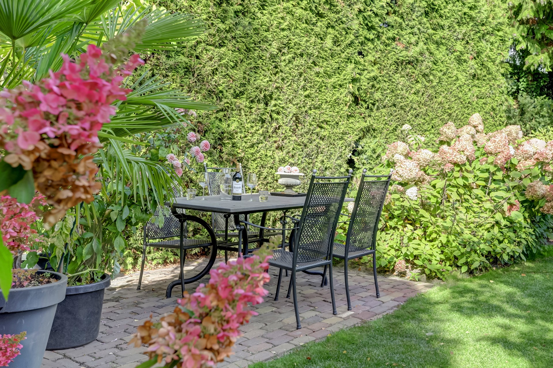 Achterin de tuin is een tweede, zonnig terras gerealiseerd. Een heerlijke plek om je even terug te trekken met een goed boek of een kop koffie in de zon. Via het stijlvolle pad loop je er zo naartoe, omringd door het groen dat deze tuin zijn unieke sfeer geeft. En vanzelfsprekend is er een beregeningsinstallatie in de tuin aanwezig.