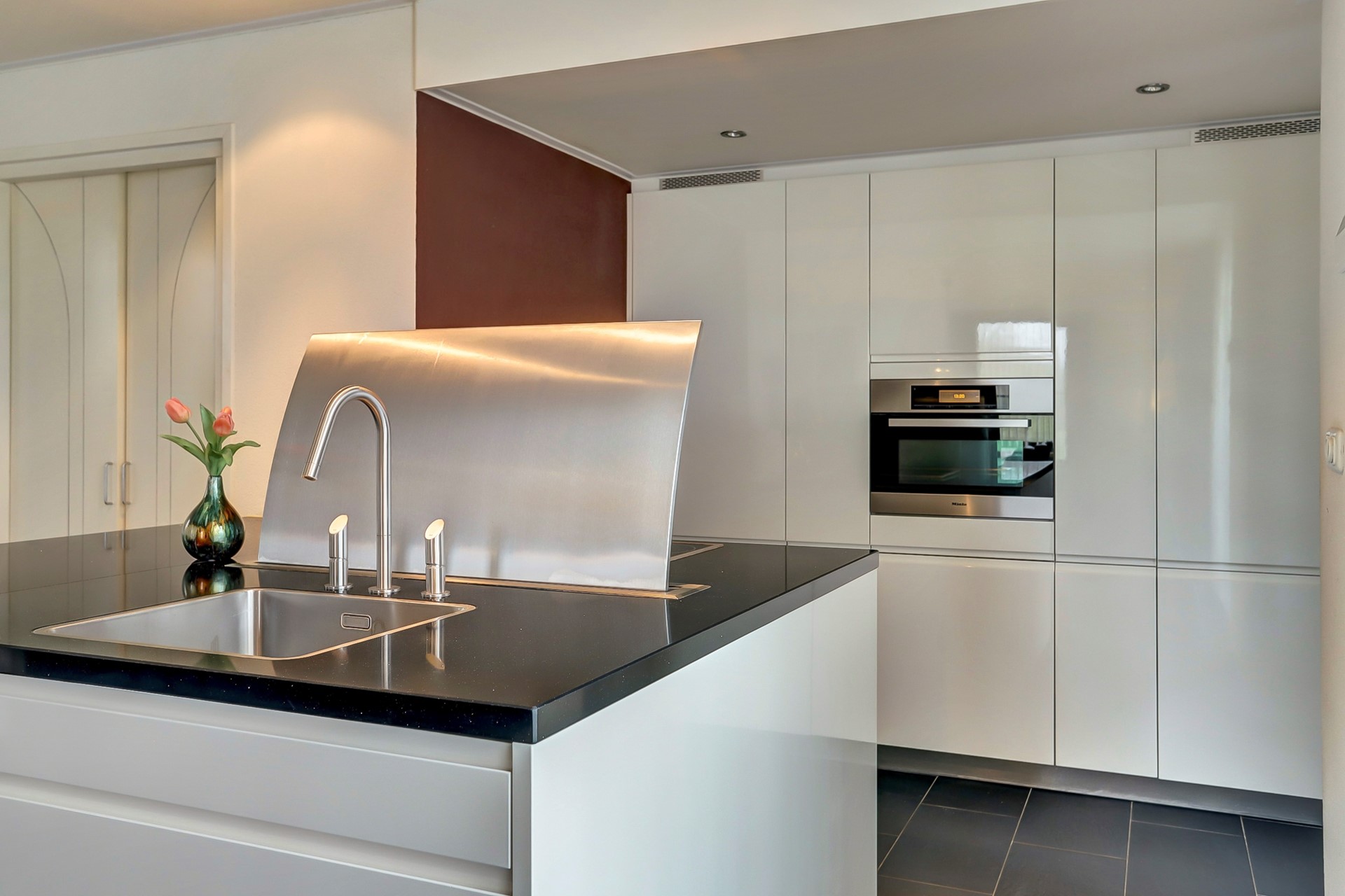 De open keuken sluit naadloos aan op de woonkamer en is praktisch en modern ingericht. Het kook- en spoeleiland vormt het hart van de keuken en biedt veel werk- en opbergruimte. De keuken is uitgerust met diverse inbouwapparatuur, waaronder een combi-oven, vaatwasser, grote koelkast, grote diepvries en een spoelbak met mengkraan. Vanuit de keuken is er toegang tot de verdiepte kelder en geeft het achterportaal een doorloop tot de sanitaire ruimtes.