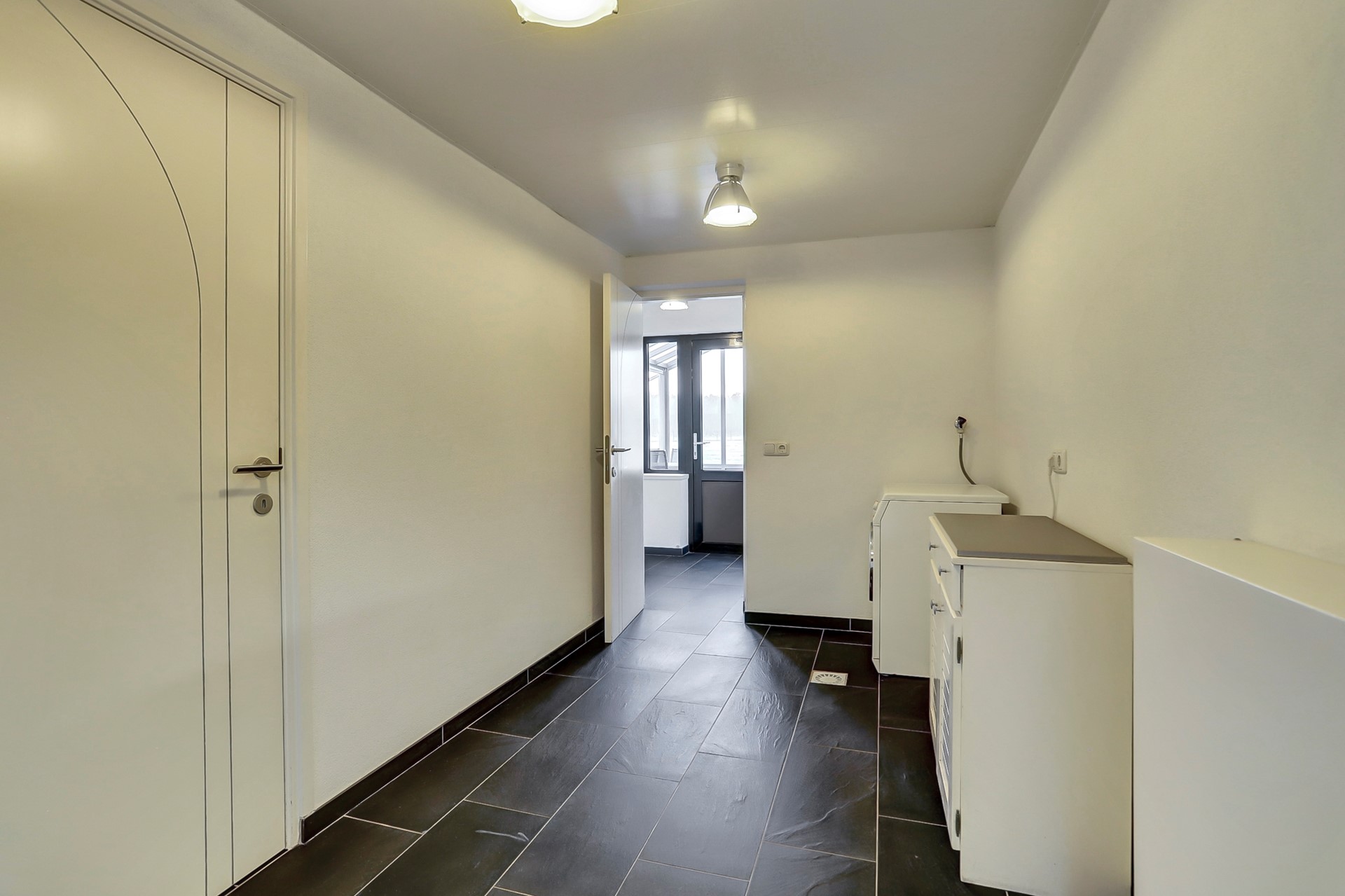 Vanuit het achterportaal lopen we door naar de wasruimte voorzien van een dubbele aansluiting voor wasmachine en droger. Aansluitend bevindt zich een tweede kamer, momenteel in gebruik als droogruimte maar dankzij de aanwezigheid van daglicht ook zeer geschikt als kantoorruimte of multifunctionele werkplek.
