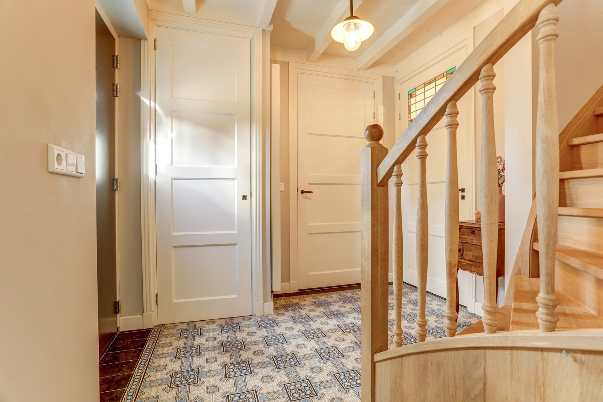 Welkom binnen in een huis dat direct een onvergetelijke indruk maakt. De hal zet meteen de toon met een prachtige vintage motief tegelvloer met sierlijke randafwerking. Samen met de stoere houten balken aan het plafond vormt dit een karaktervol geheel dat je direct nieuwsgierig maakt naar de rest van het huis.