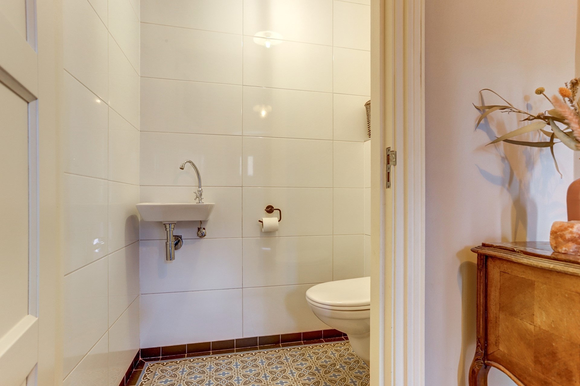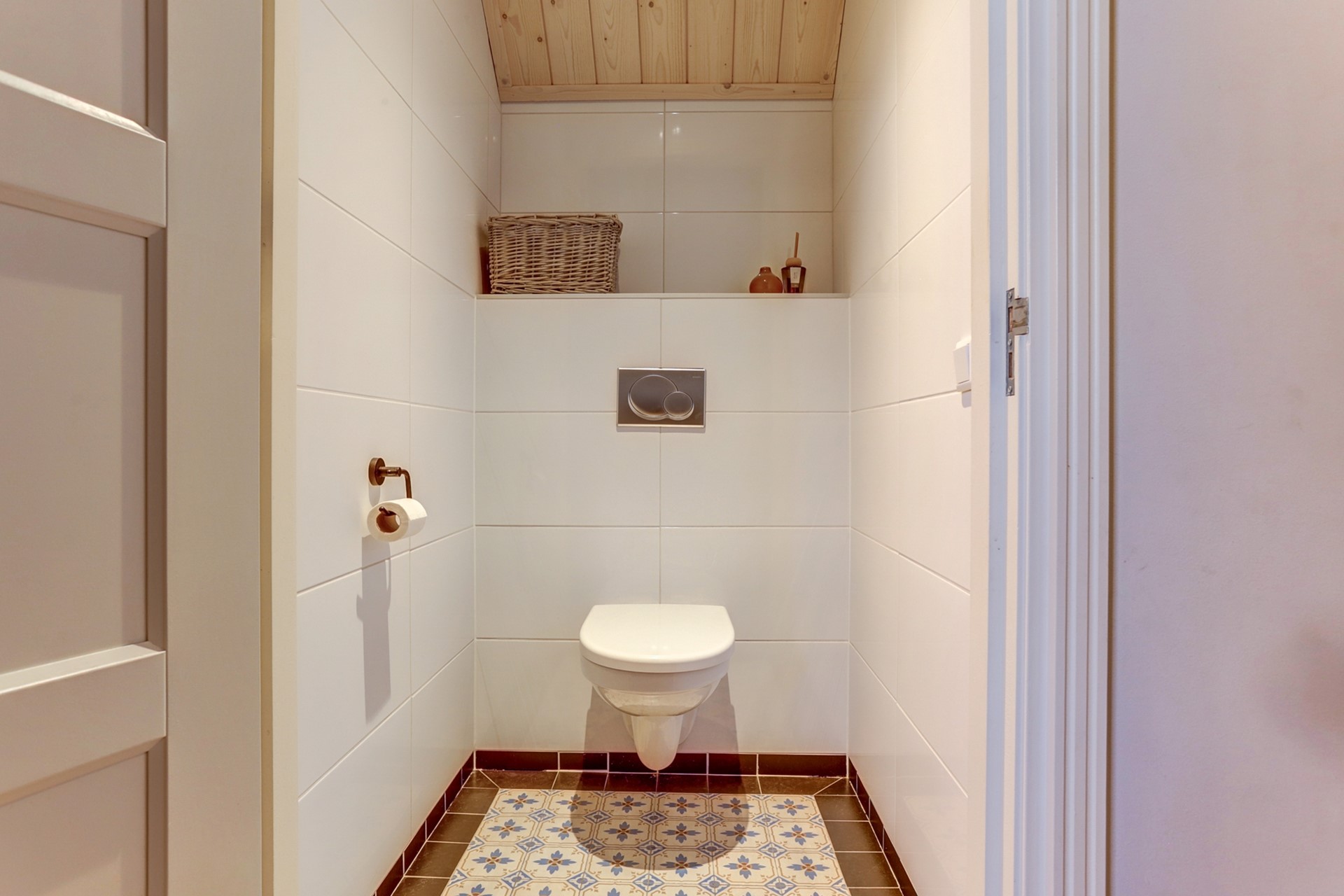 Ook in het aparte toilet komt het landelijke karakter van de woning direct terug. Op de vloer liggen opnieuw prachtige vintage tegels die naadloos aansluiten bij de rest van de woning. Het moderne hangcloset maakt de ruimte compleet.