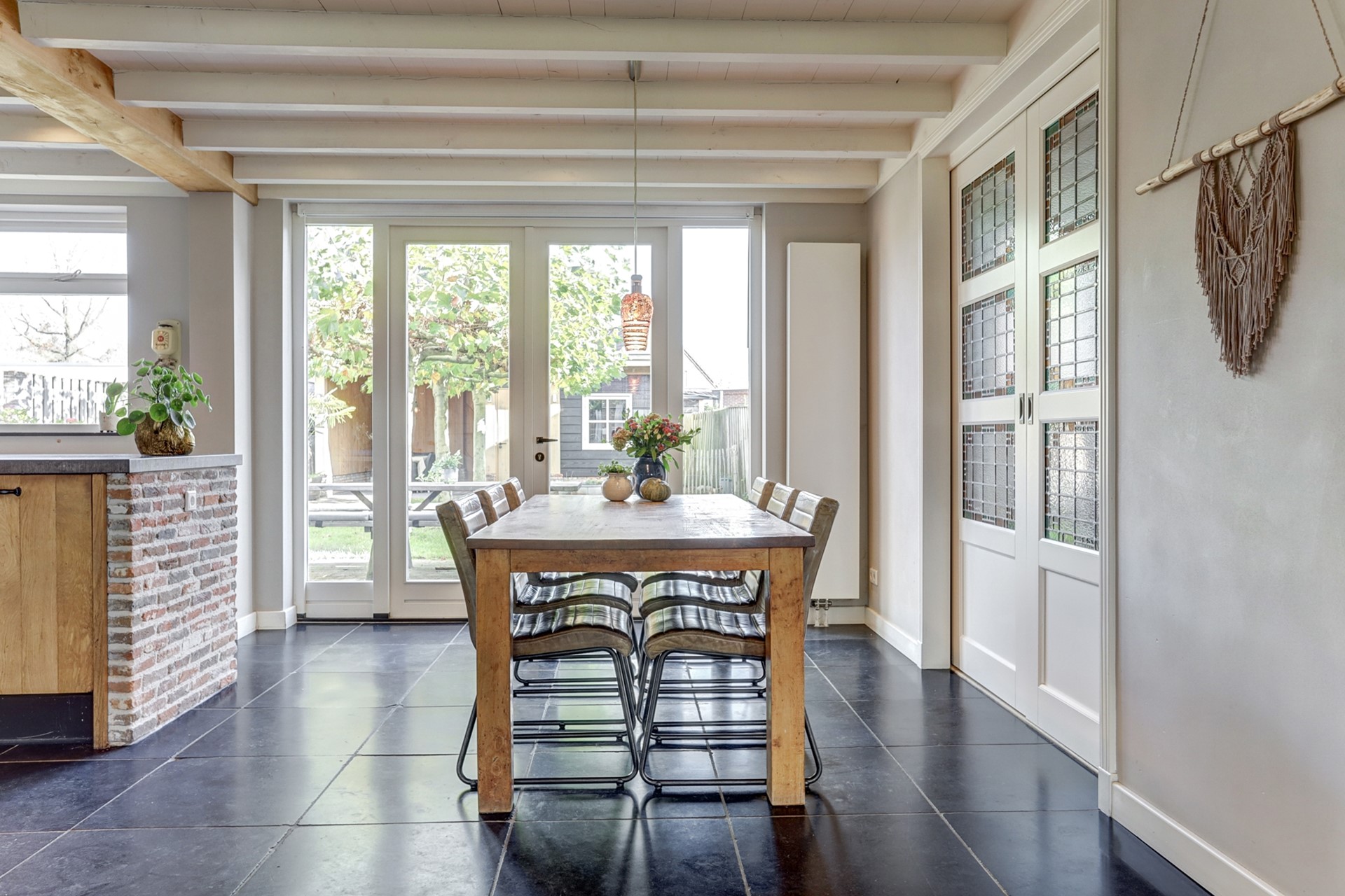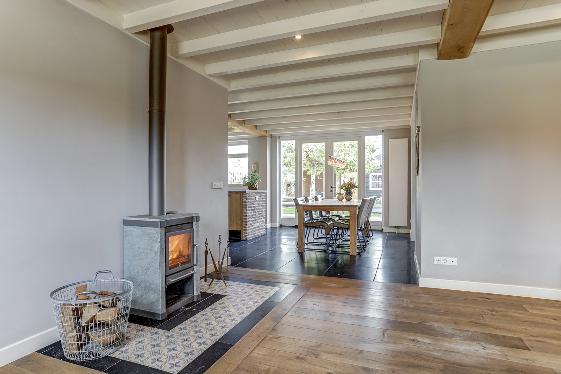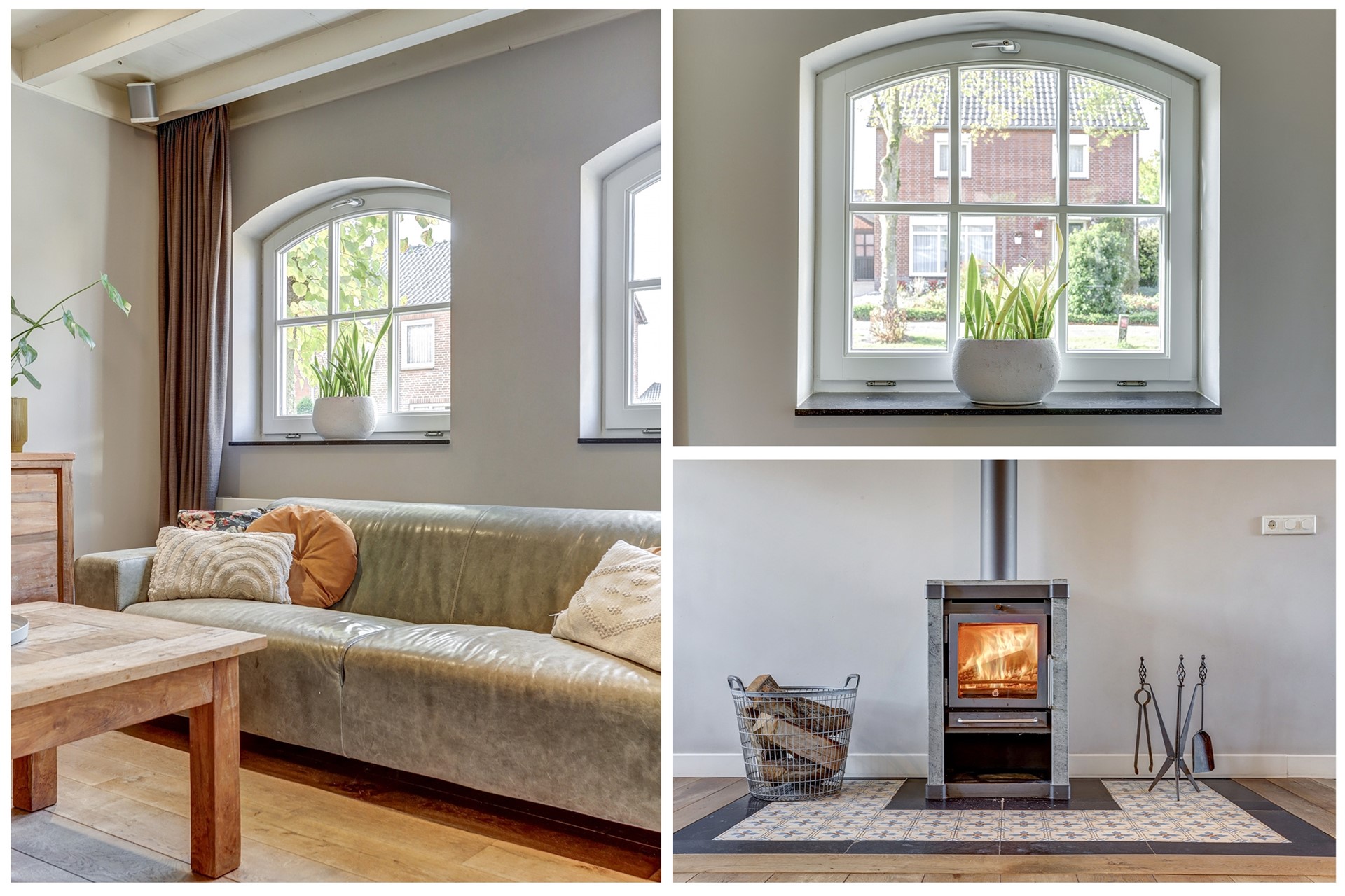 Zodra je de woonkamer binnenstapt voel je direct de sfeer van het huis. De houten vloer gecombineerd met het balkenplafond brengen een warme, natuurlijke sfeer, terwijl de charmante halfronde raampjes met roedes aan de voorzijde zorgen voor een landelijk accent. Aan de linkerzijde staat een heerlijke spekstenen houtkachel, omringd door kleine vintage tegeltjes die het plaatje helemaal afmaken. Een heerlijke plek om op koude dagen weg te kruipen bij het vuur.