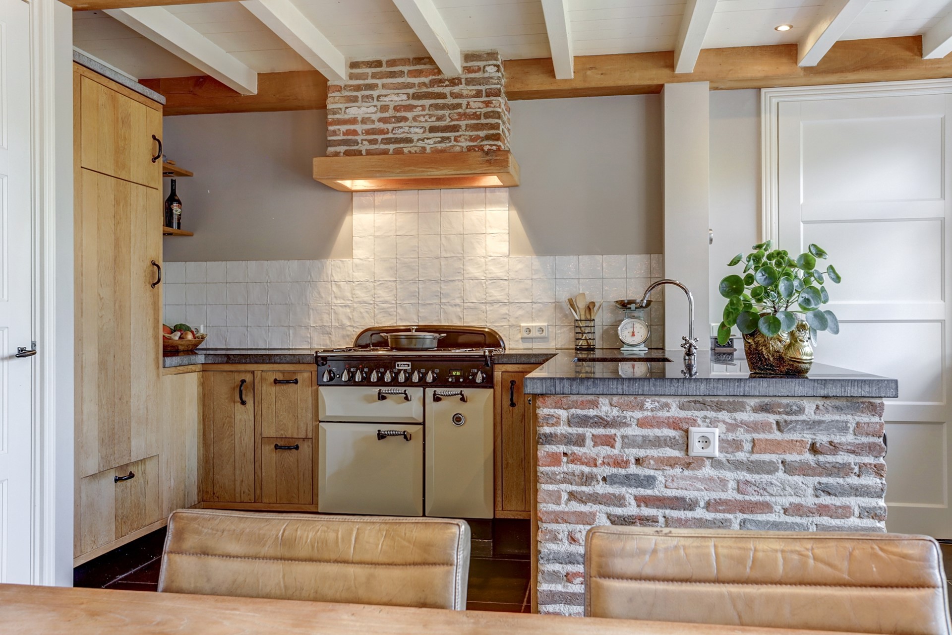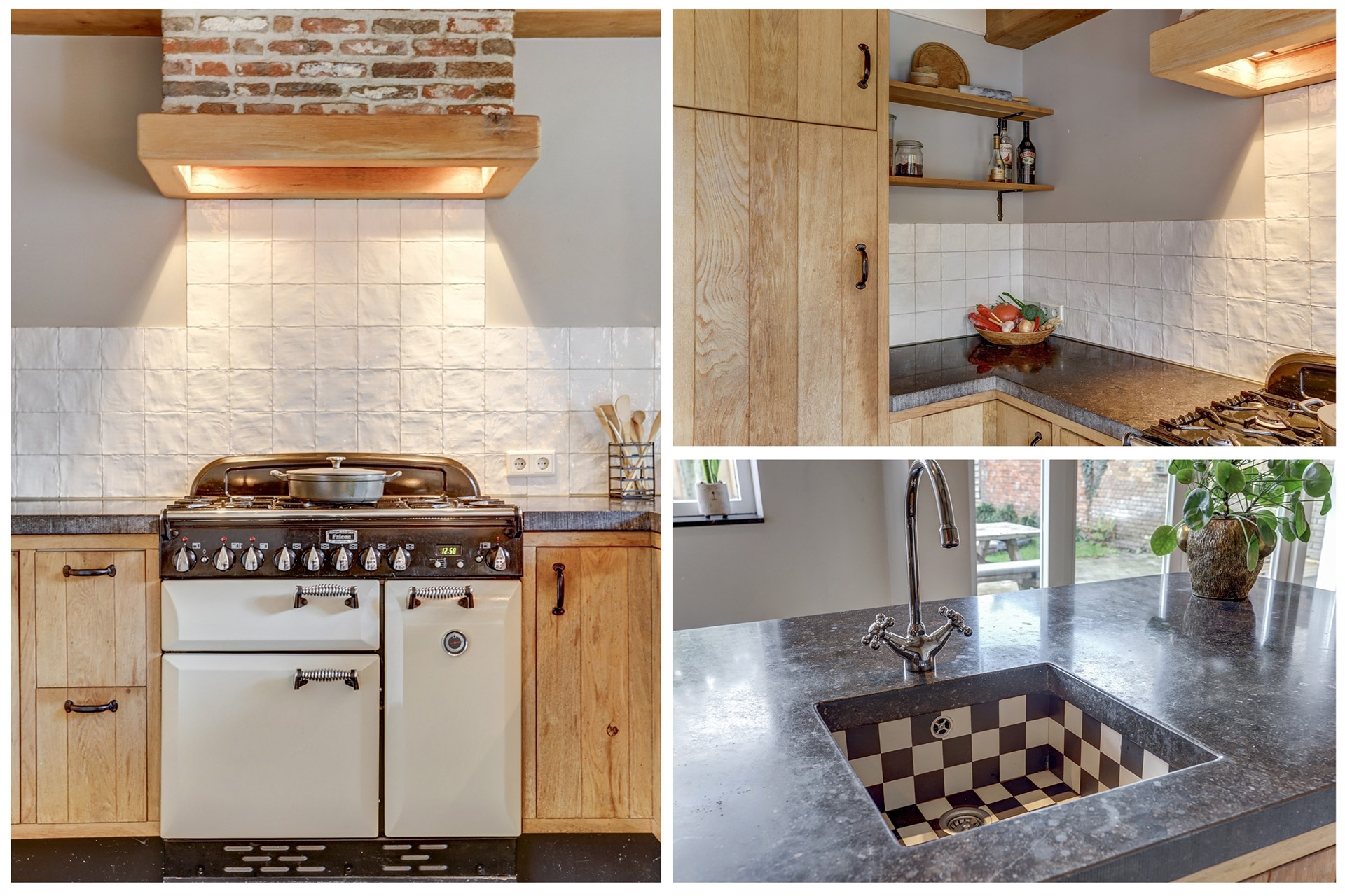 De open keuken is het ware pronkstuk van de woning en vormt dan ook het hart van deze woonboerderij; een plek waar ambacht en karakter hand-in-hand gaan. De tegelvloer komt prachtig tot zijn recht naast de handgemaakte eikenhouten keuken en de deels gemetselde muren en geeft de ruimte een robuuste en landelijke uitstraling. Het werkblad is ruimschoots en uitgevoerd in Belgisch hardsteen en de tegeltjes op de achterwand maken het geheel compleet, terwijl de zwart- witte tegeltjes bij de wasbak, een speelse knipoog naar vroegere tijden geven.