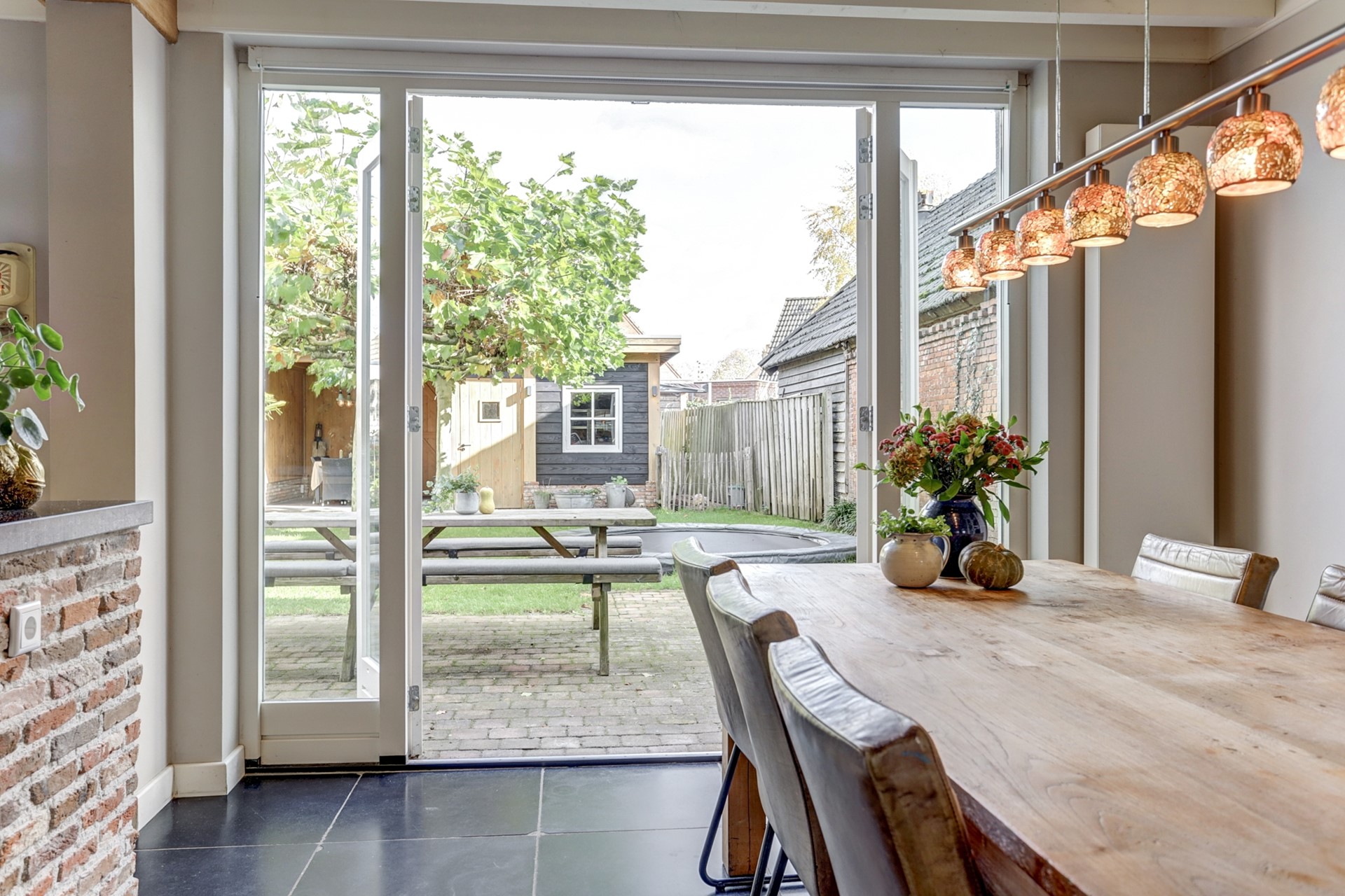 Aan de achterzijde van de woning, openen twee hardhouten tuindeuren zich naar buiten waardoor het daglicht rijkelijk binnenvalt en binnen en buiten dan ook naadloos in elkaar overlopen.