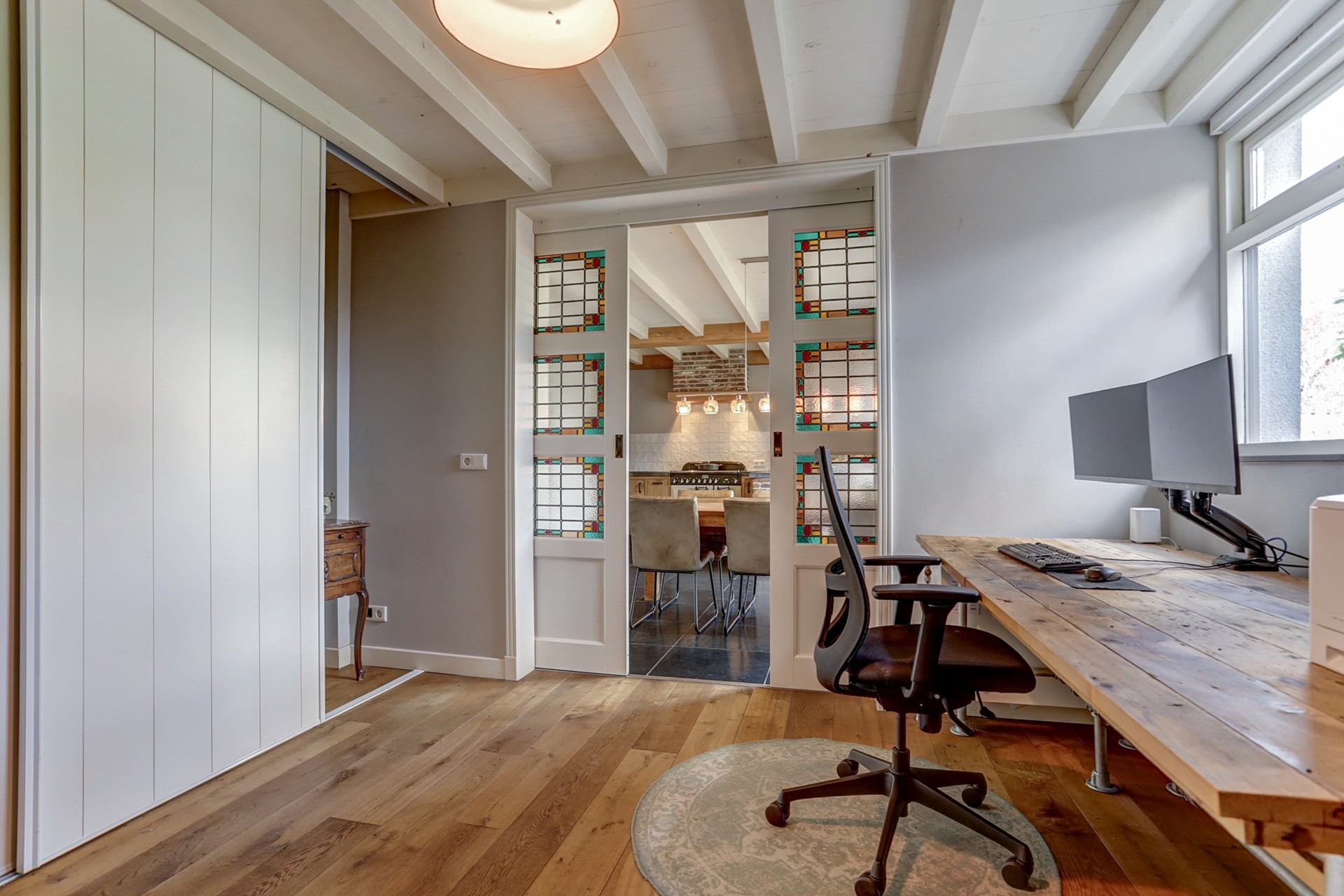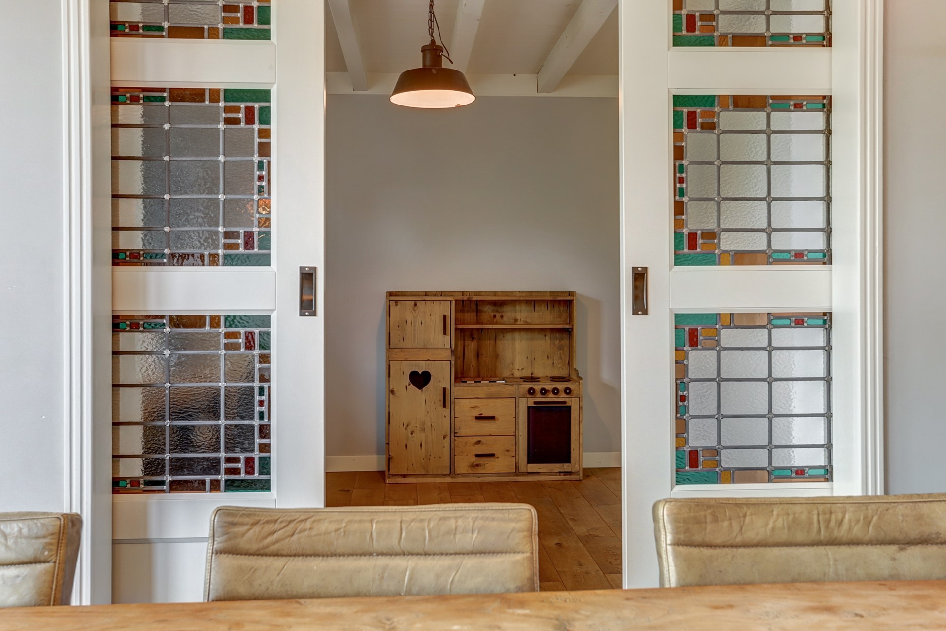 Via de prachtige ensuite deuren met handgemaakt glas-in-lood bereik je een extra ruimte welke momenteel in gebruik genomen wordt als speel- en werkkamer. Deze ruimte is multifunctioneel te gebruiken en beschikt nog over een grote kastenwand.