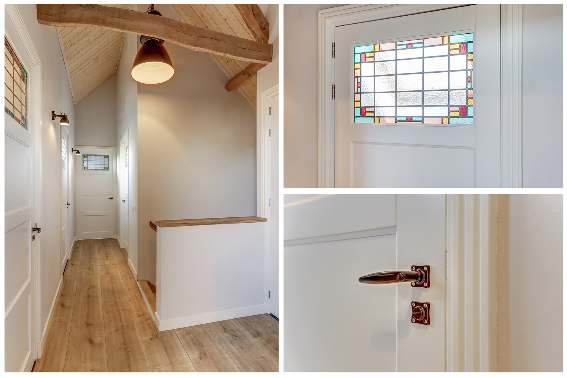 Via de eikenhouten trap lopen we naar de eerste verdieping. Boven aangekomen valt direct je oog op de landelijke details die deze verdieping haar karakter geven. Allereerst dat waanzinnige zicht tot in de nok, de robuuste balken en het prachtige glas-in-lood in de paneeldeuren.
