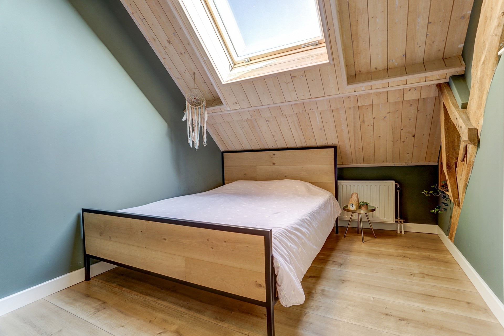 Aan de linkerzijde van de woning liggen twee identieke slaapkamers. Beide kamers zijn ruim genoeg om een tweepersoonsbed, een kledingkast en bureau kwijt te kunnen. Het dakraam zorgt voor veel natuurlijk daglicht en een fijne ventilatie, terwijl het hoge plafond en de robuuste balken de kamers karakter en landelijke sfeer geven.