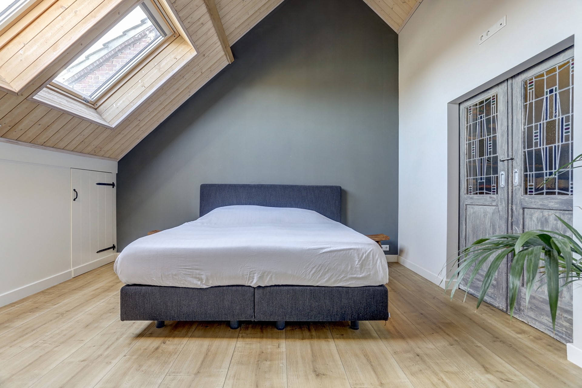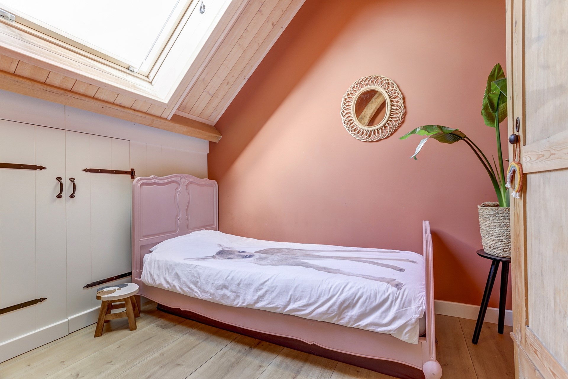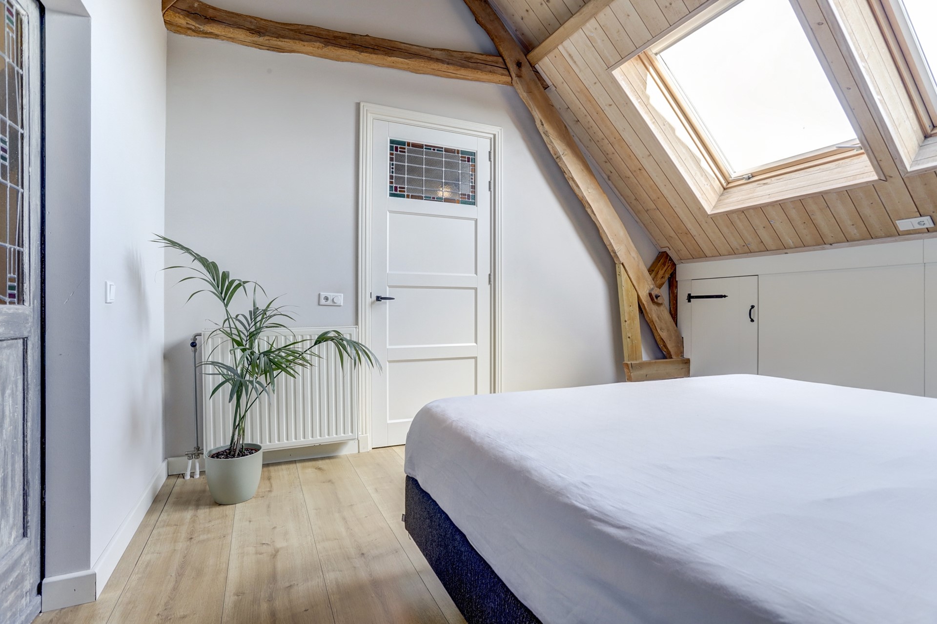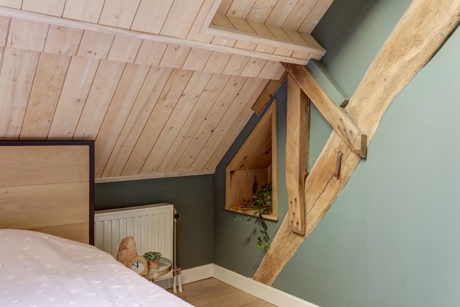Alle slaapkamers op deze verdieping delen hetzelfde prachtige element: de hoge nok met zichtbare houten balken, die overal voor een gevoel van ruimte en karakter zorgt.