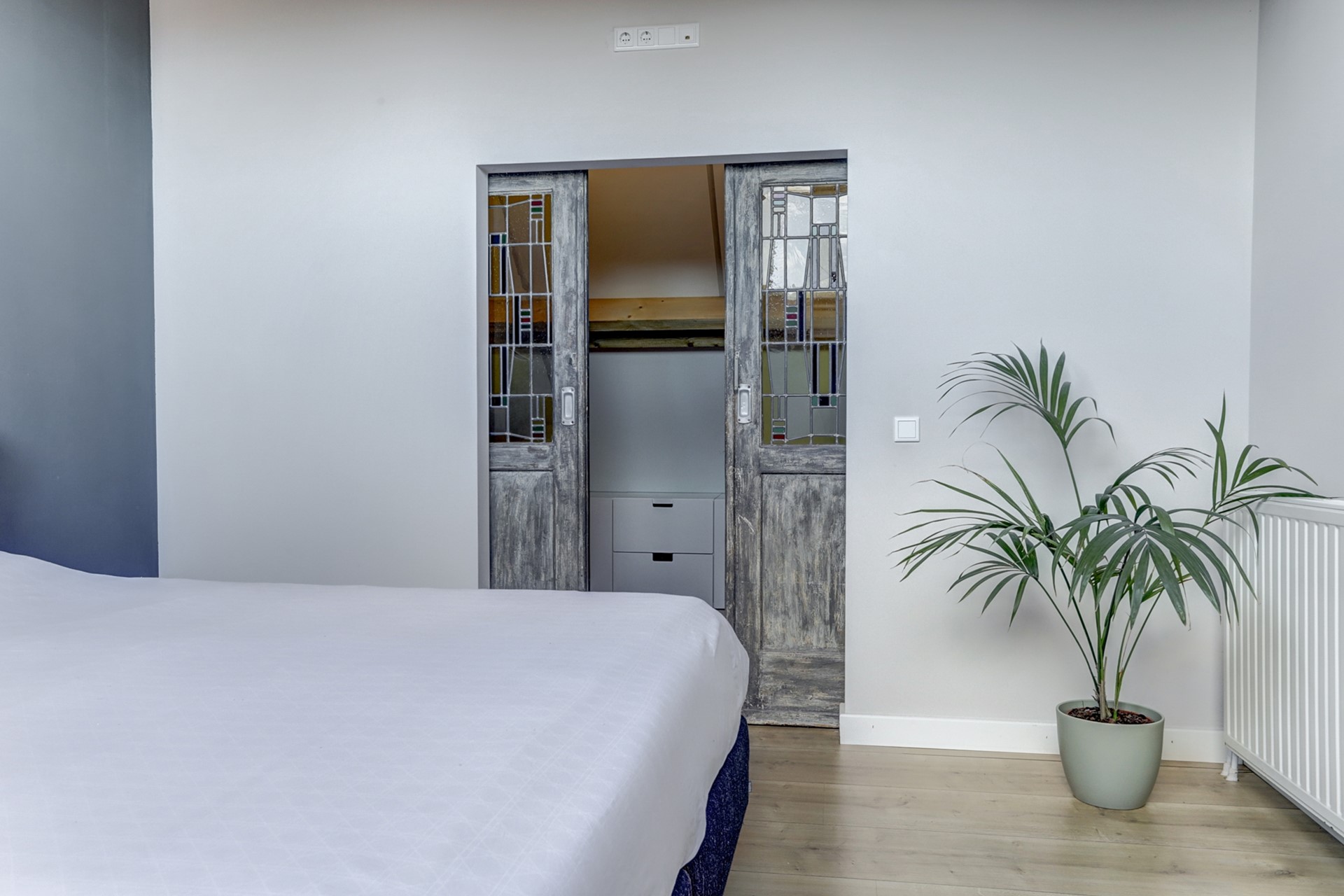 En dan… via de authentieke jaren ’30 ensuite-deuren met glas-in-lood bereik je de droom van elke vrouw: een ruime walk-in closet. En ja, deze is écht groot genoeg om al jouw kleding overzichtelijk in op te bergen! Comfort, stijl en landelijke charme komen hier perfect samen.