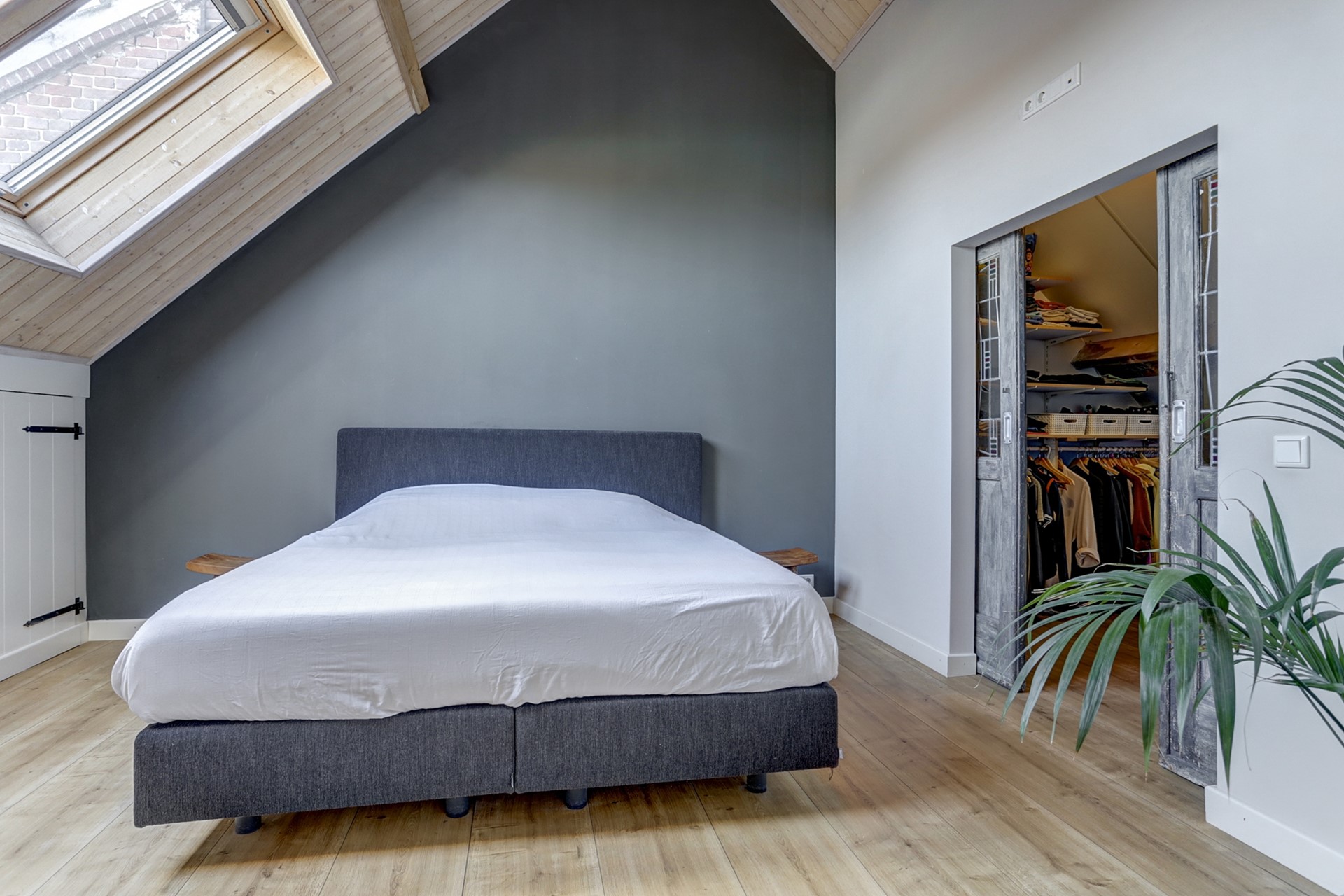 Zodra je de masterbedroom binnenloopt, word je direct verliefd op deze ruimte. De prachtige hoge nok en de robuuste houten balken zorgen voor dat landelijke effect. Riante dakramen laten volop zonlicht binnen en zorgen voor een natuurlijke ventilatie. Onder de schuine kant is extra opbergruimte beschikbaar, handig en praktisch weggewerkt.