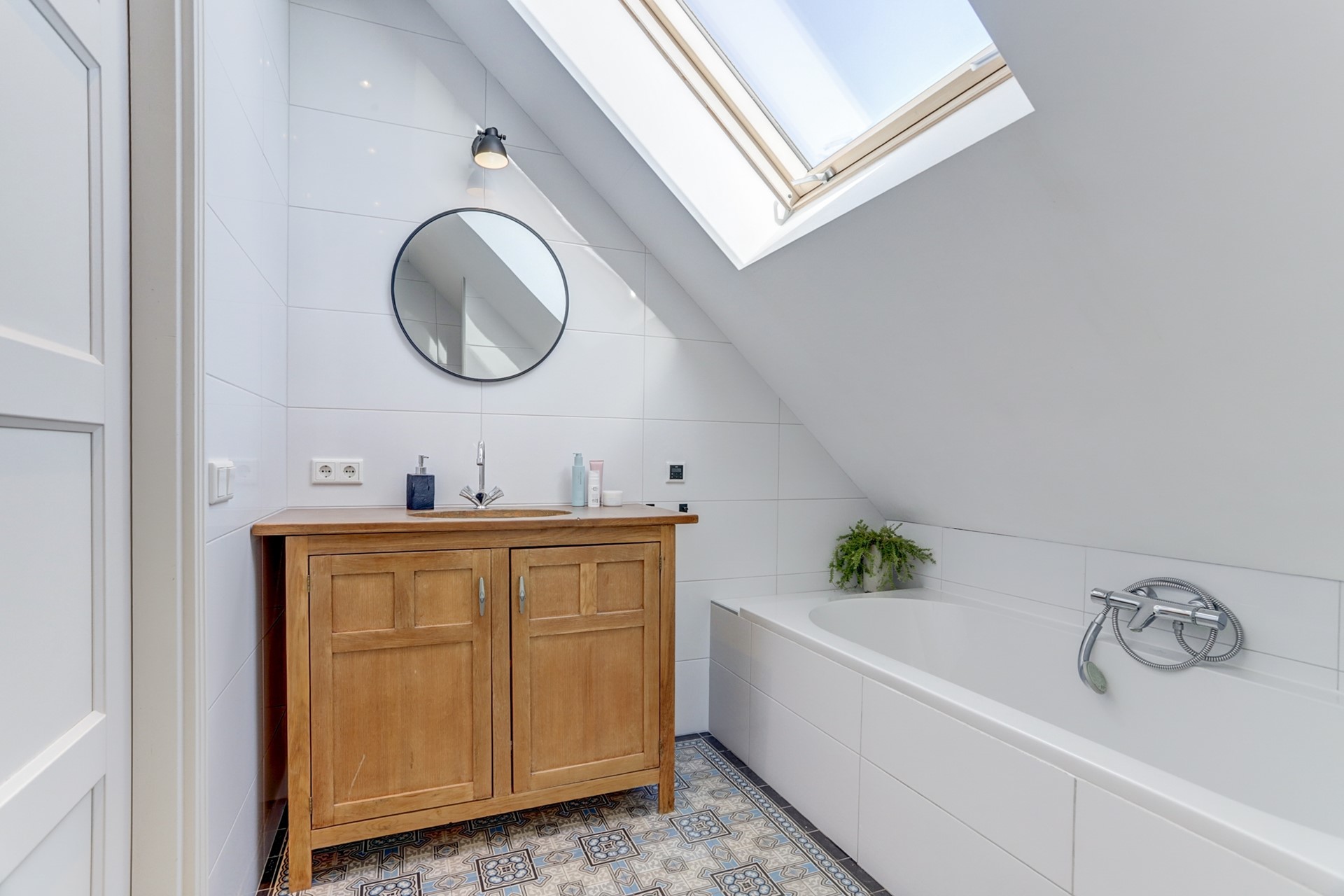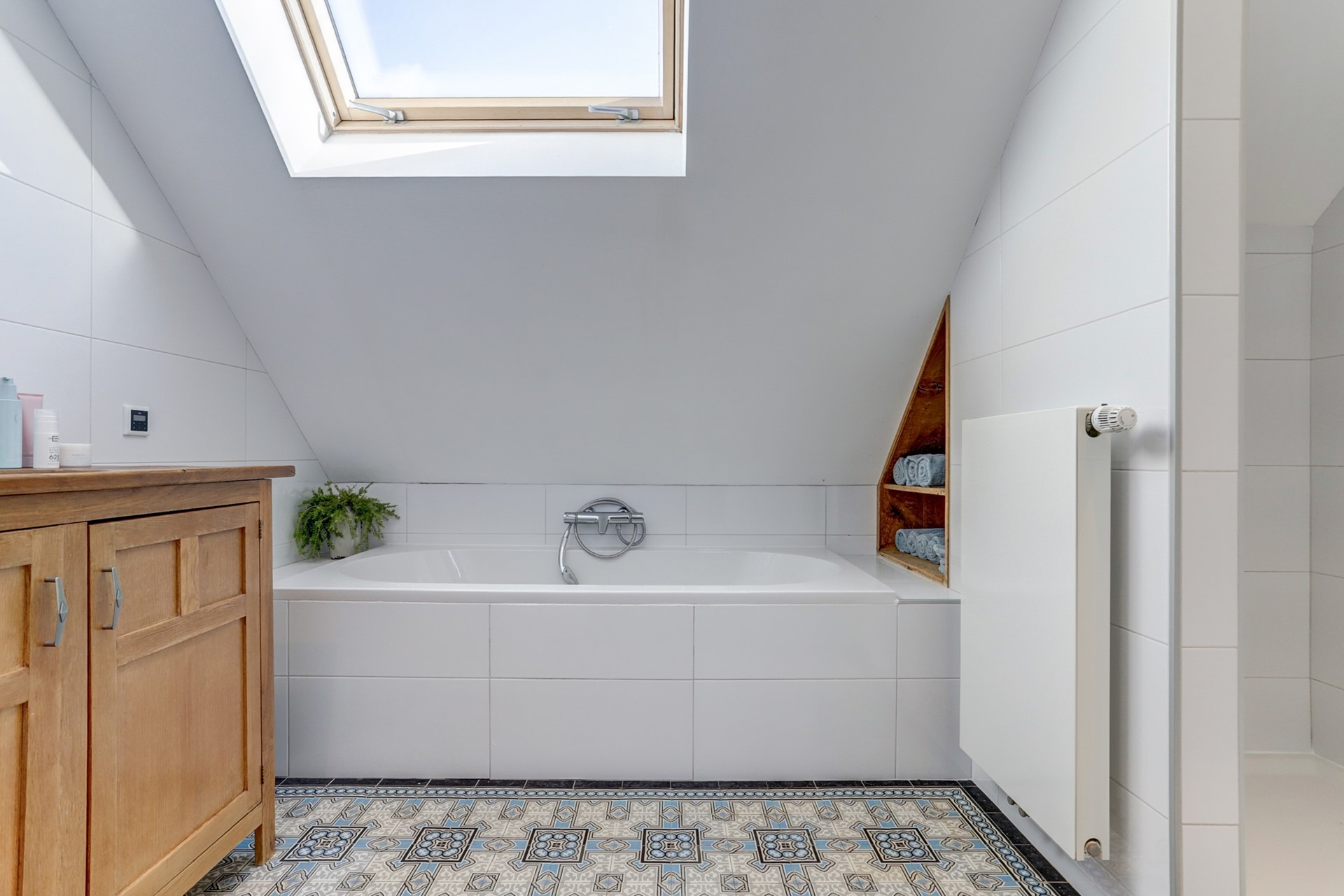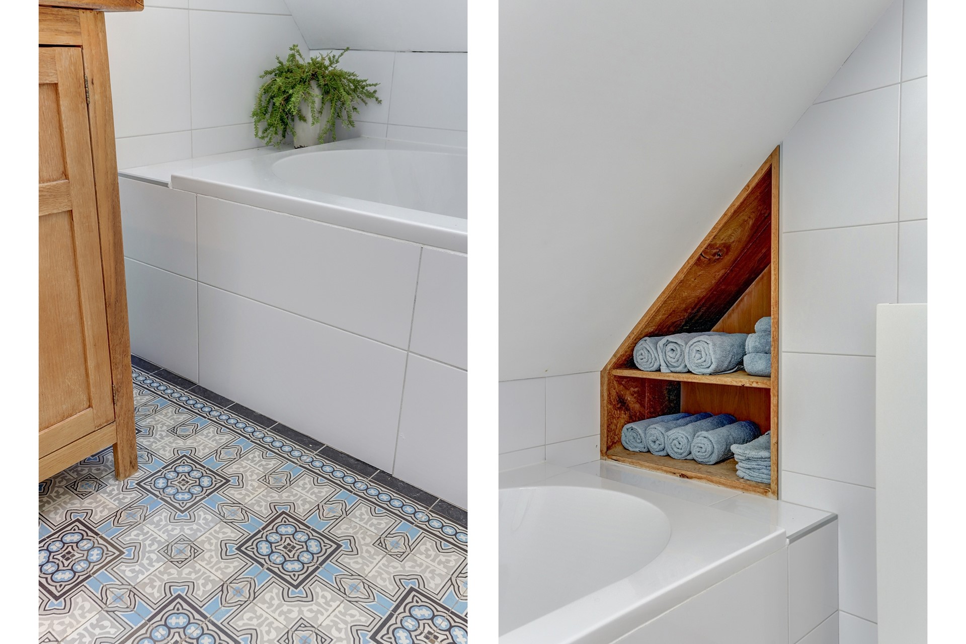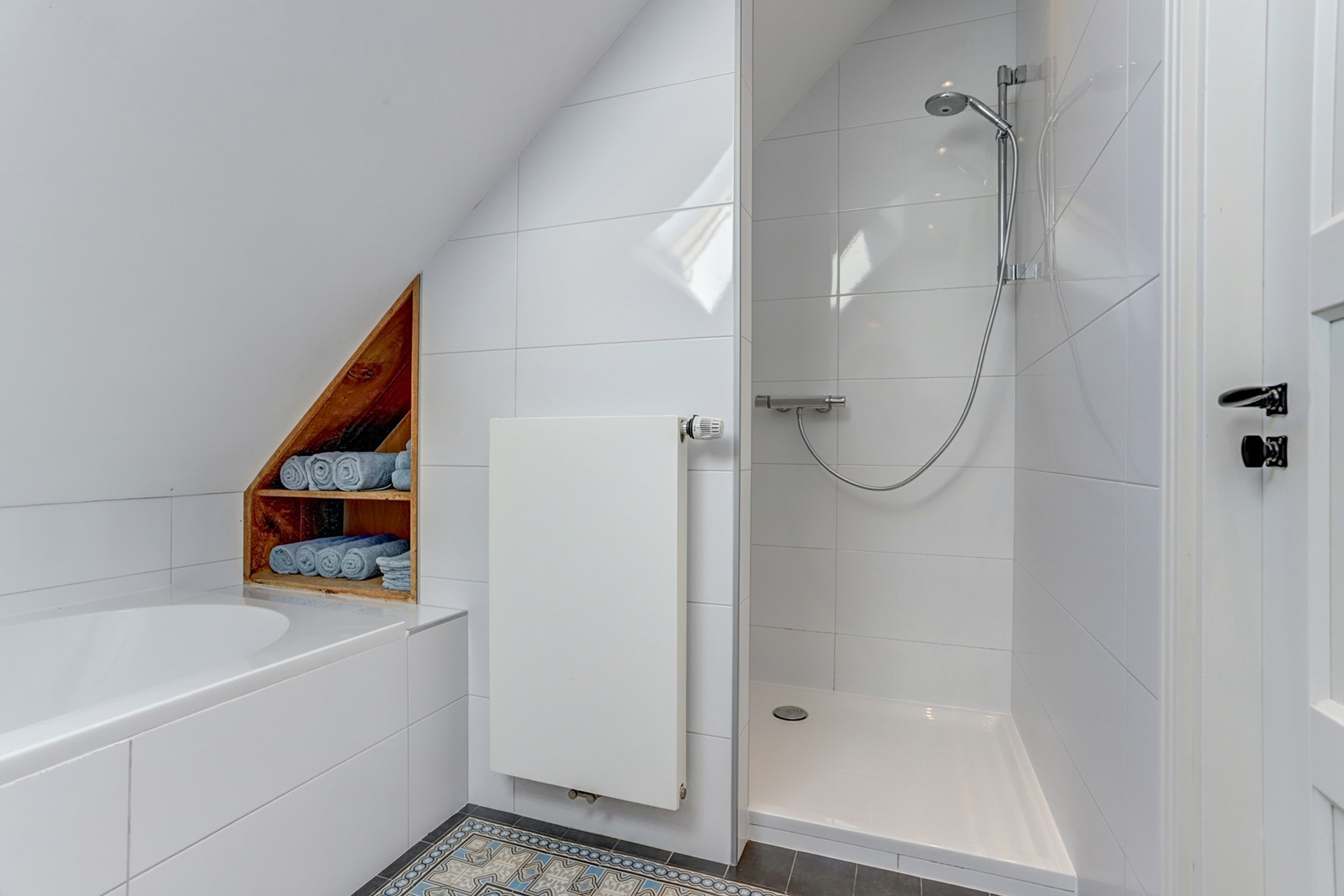 Zodra je de badkamer binnenstapt, valt je oog direct op de prachtige vintage motief tegels en de antieke kast met wastafel, die meteen een charmant detail toevoegt aan de landelijke uitstraling. Verder vind je hier een royale inloopdouche, een heerlijk ligbad en designradiator, een fijne ruimte om de dag ontspannen te beginnen. Een praktische inbouwkast biedt extra opbergruimte voor handdoeken en toiletartikelen.