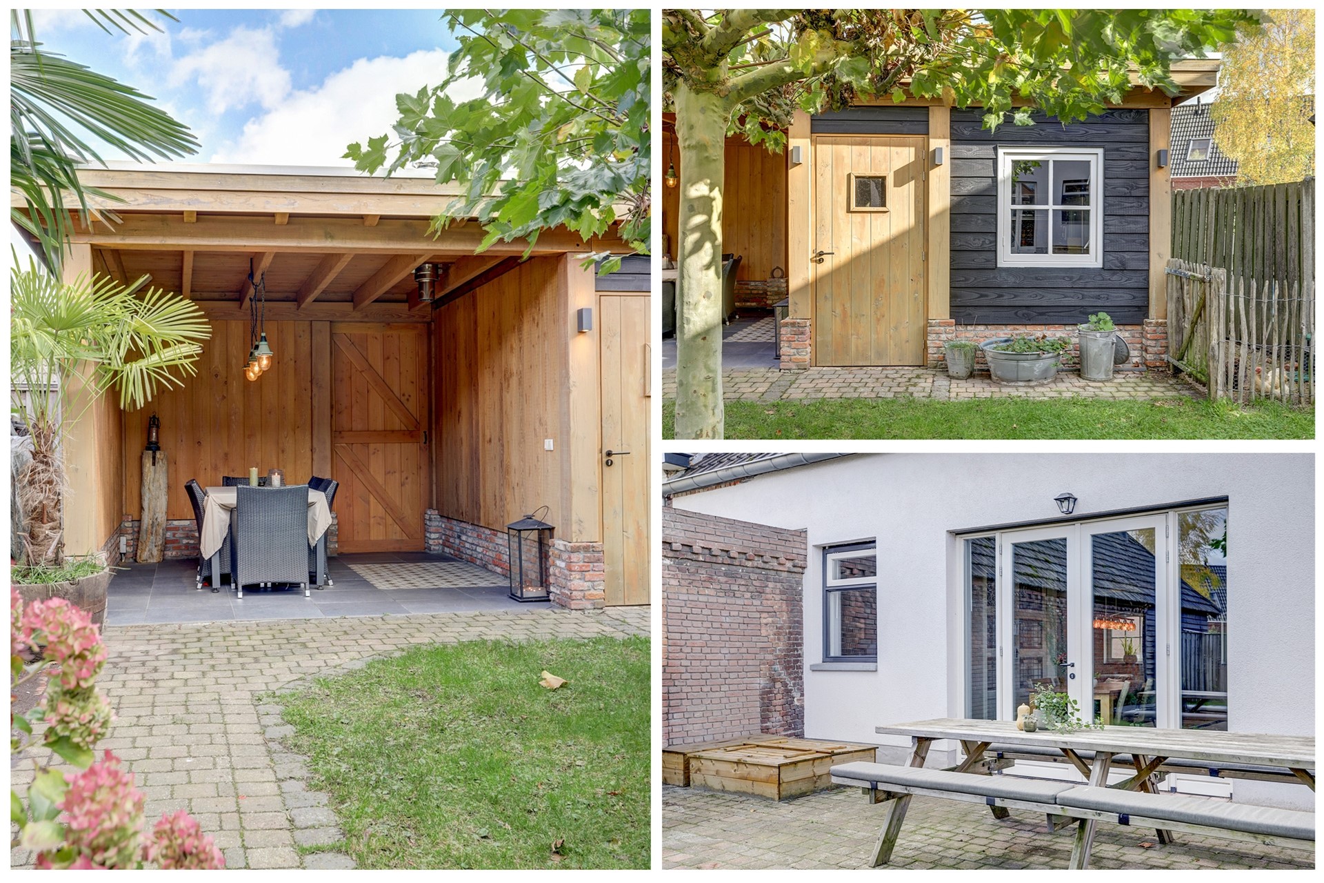 Achter de overkapping leidt een schuifdeur naar de houtopslag, een handig en charmant detail dat het landelijke geheel compleet maakt.