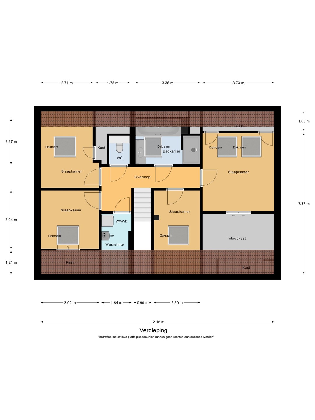 Vanuit de overloop heb je toegang tot vier slaapkamers, de badkamer, het toilet en de wasruimte.