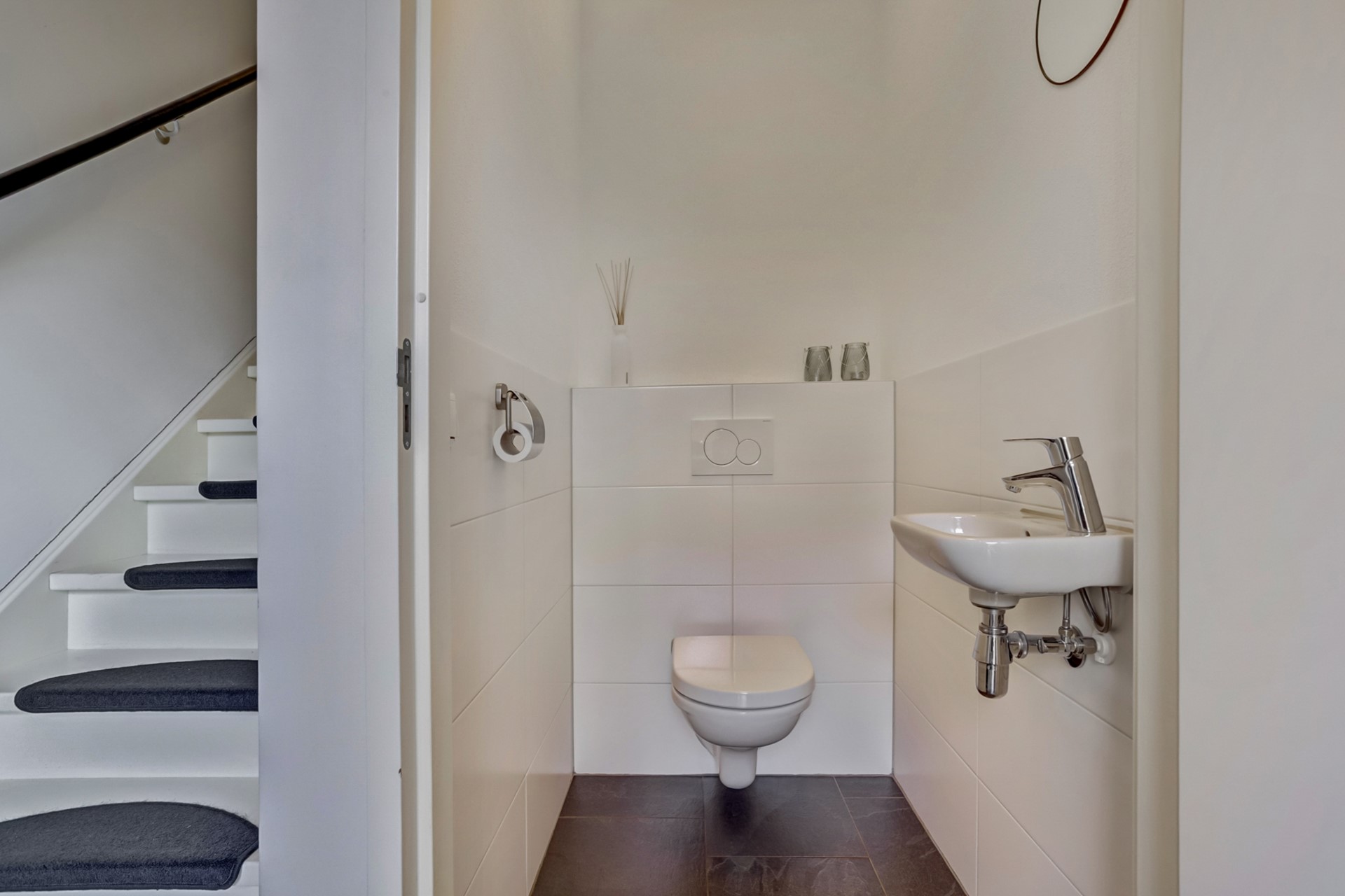 De entreehal is voorzien van een moderne tegelvloer v.v. vloerverwarming, strakke wanden-en plafonds en beschikt over een meterkast voorzien van glasvezel en modern toilet, welke halfhoog betegeld is en voorzien van hangcloset en fonteintje. Vanuit de hal heb je toegang tot de eerste verdieping en de keuken.