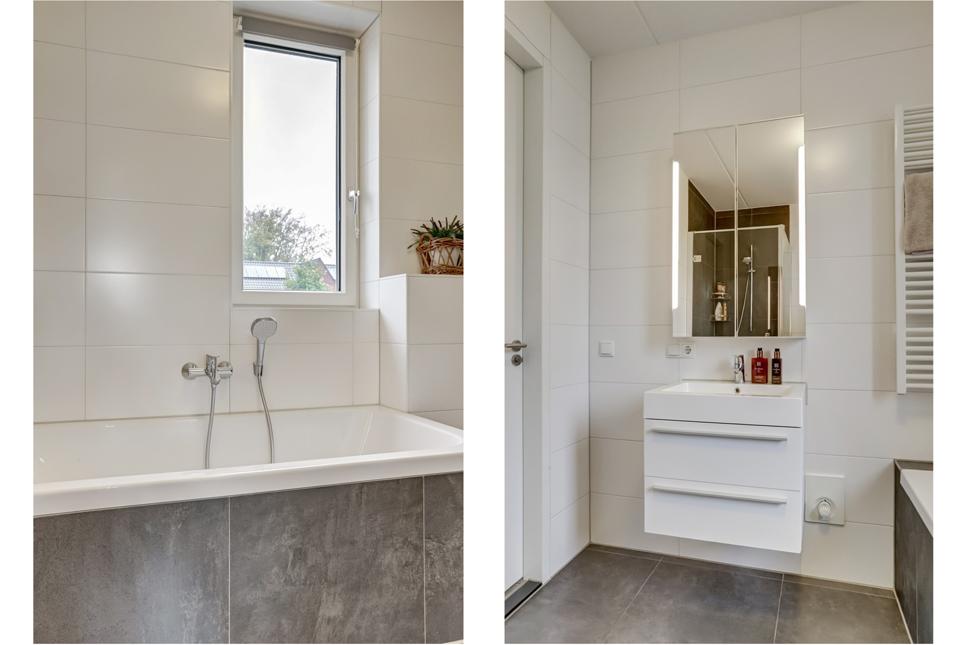 De badkamer is volledig betegeld en beschikt over een ligbad, douche, toilet en een badmeubel met wasbak. Voor extra comfort zijn er horren aanwezig en is de vloer voorzien van vloerverwarming, ideaal om je voeten warm te houden tijdens koude ochtenden.